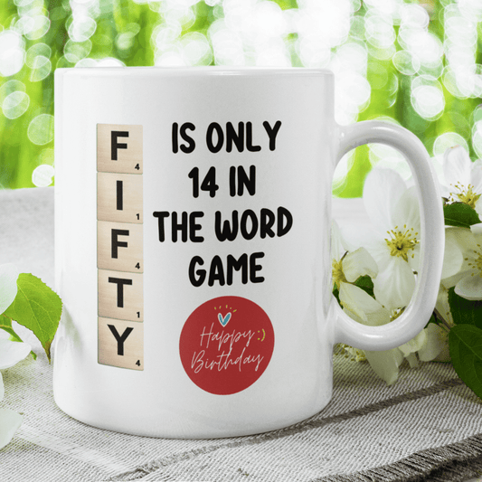 Birthday Gift, Custom 50th Birthday Mug: Fifty Is Only 14 In The Word Game