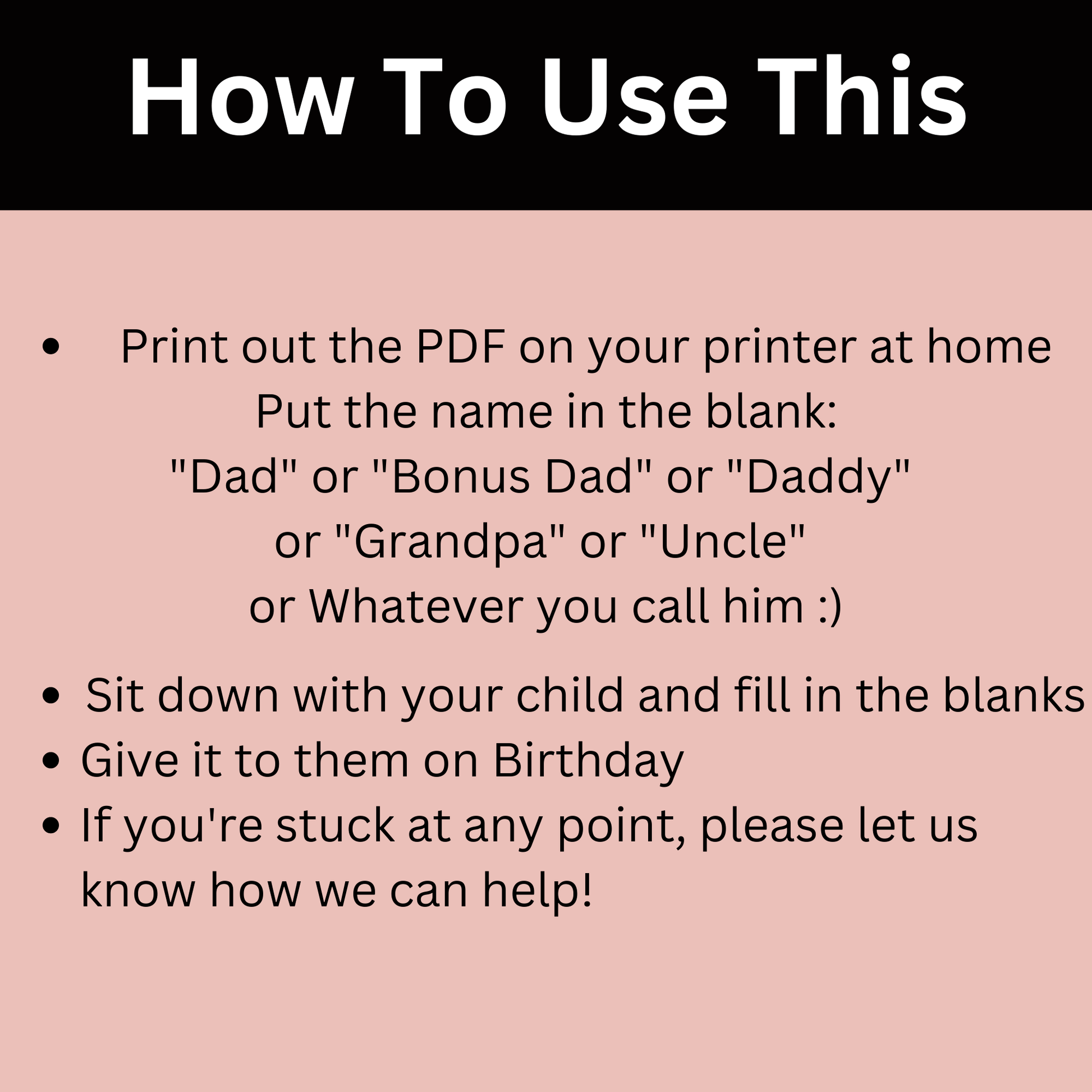 Thank you for choosing our shop to help you create treasured memories that will last a lifetime. Order your digital download today and give your dad, bonus dad, stepdad, grandpa, uncle, etc. a gift they will cherish forever!