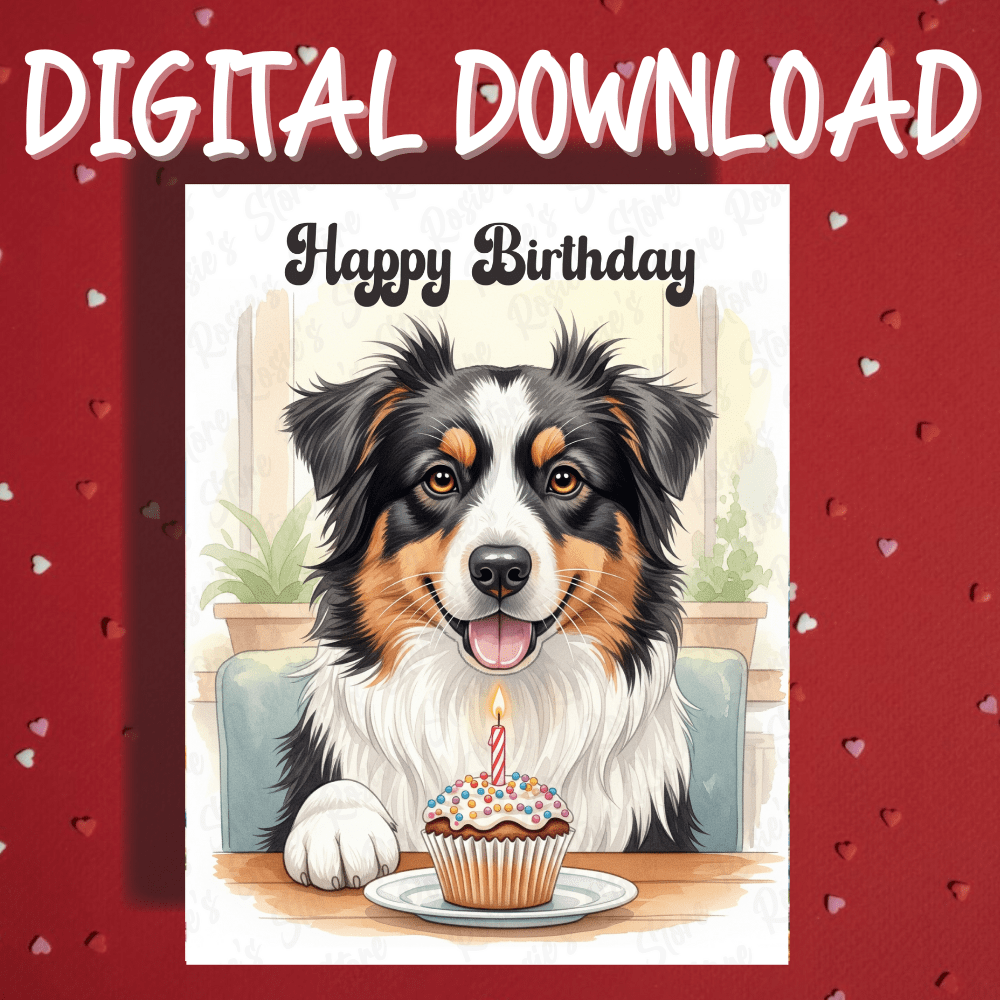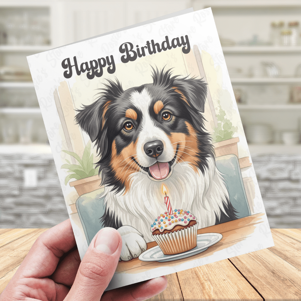 Celebrate a special day with our adorable "Happy Birthday" card, featuring a charming watercolor illustration of a festive Australian Shepherd with a delicious birthday cupcake! 🎂🐕 This unique illustrated card is the perfect way to send warm wishes to any Australian Shepherd dog pet lover, dog dad, or dog mom.
