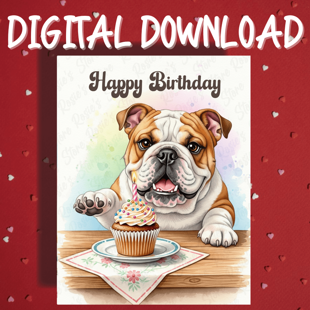 Send snorts of joy and birthday cheers with our delightful "Happy Birthday" card, featuring an adorable watercolor illustration of a charming Bulldog with a delicious birthday cupcake! 🎂🐾 This unique illustrated card is the perfect way to celebrate any Bulldog dog pet lover, dog dad, or dog mom.