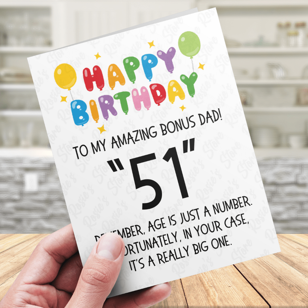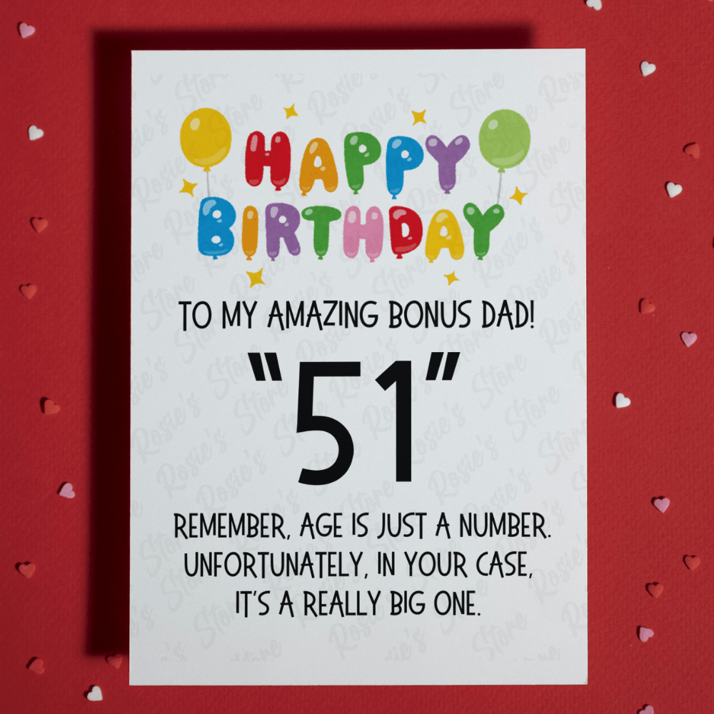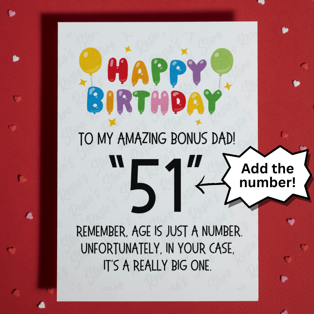 Introducing our humorous and personalized birthday greeting card: "Happy birthday to my amazing Bonus Dad! [Custom age number] Remember, age is just a number. Unfortunately, in your case, it's a really big one." The customer can enter the bonus dad's age to replace '[Custom age number]'. This card measures 4.25" x 5.5" and is crafted from high-quality, ACID-FREE, thick, and durable paper - proudly MADE IN USA! A white envelope is included with each card for added convenience.