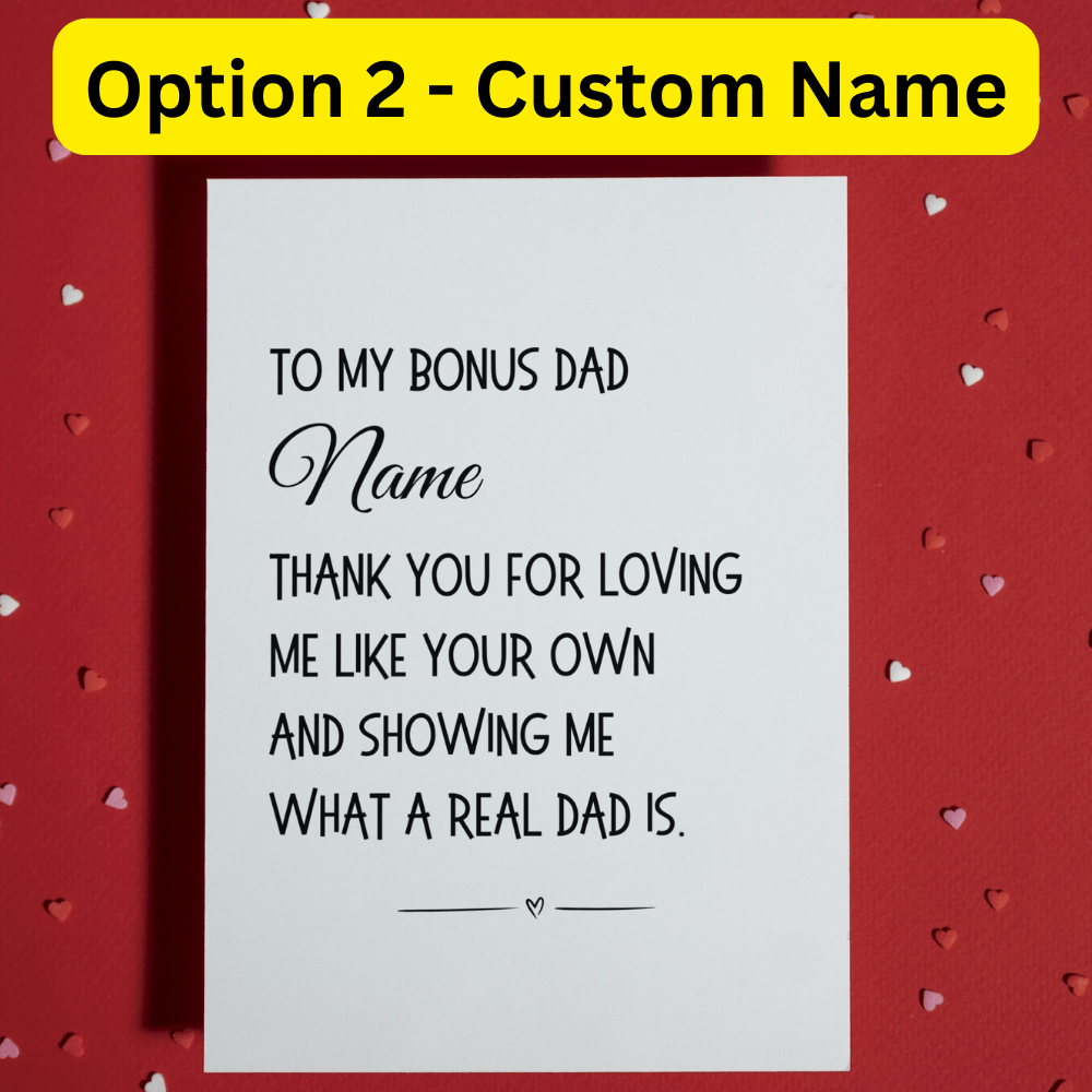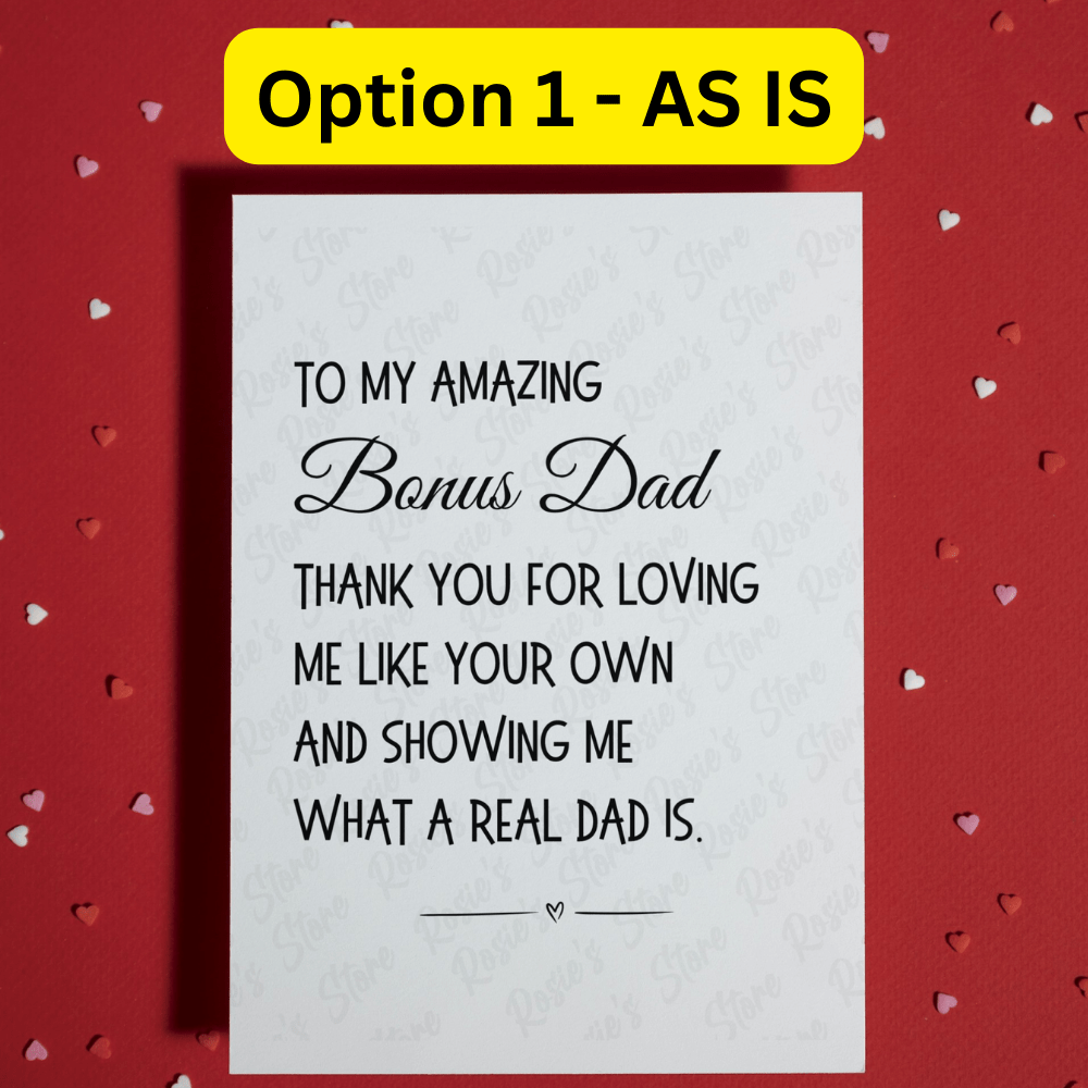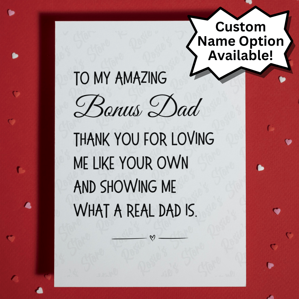 Introducing our heartfelt and touching greeting card: "To my amazing Bonus Dad. Thank you for loving me like your own and showing me what a real dad is." This card is available in two options: Option 1 AS IS, and Option 2 can be customized with your bonus dad's name. Measuring 4.25" x 5.5", this card is crafted from high-quality, ACID-FREE, thick, and durable paper - proudly MADE IN USA! A white envelope is included with each card for added convenience.