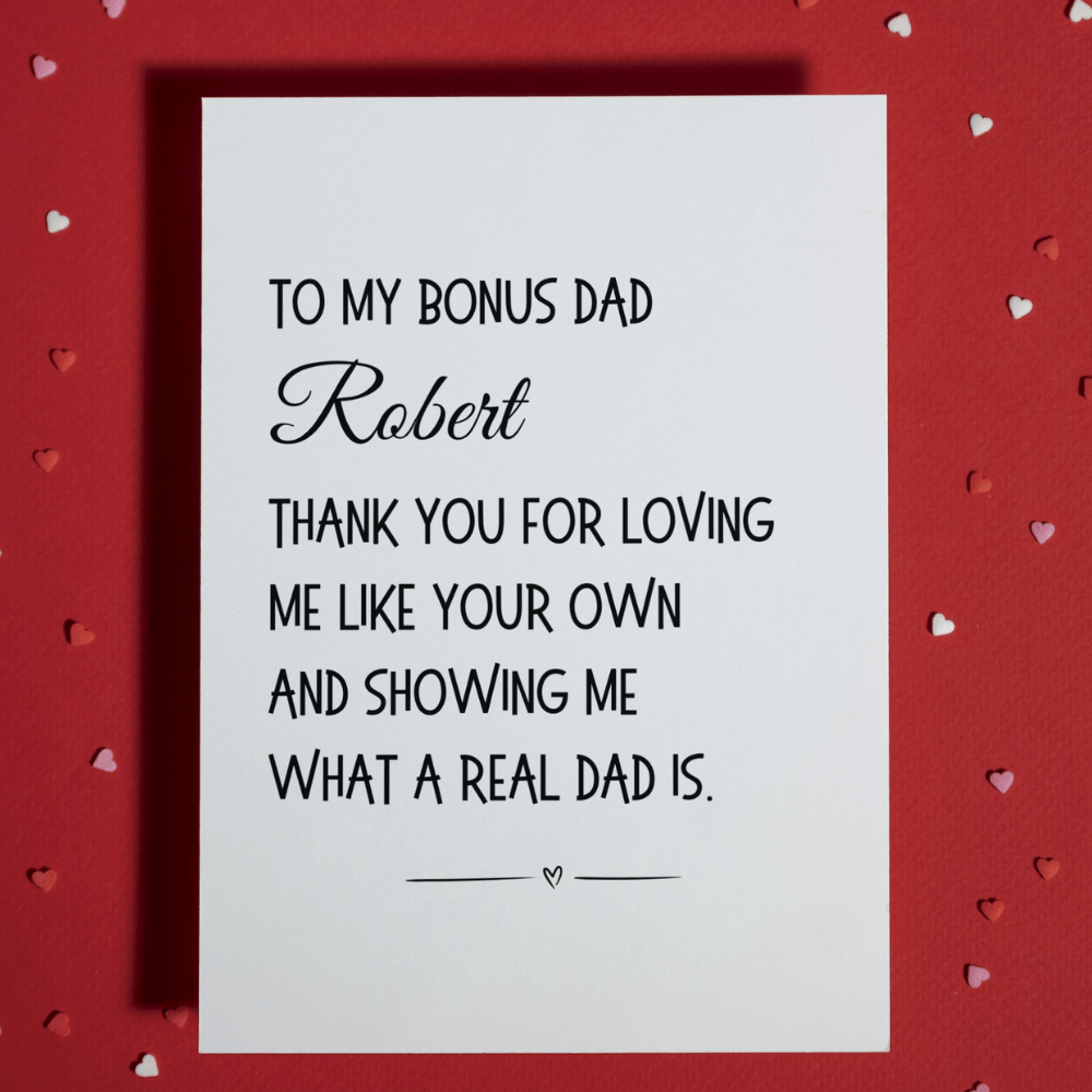 Perfect for various occasions, this card is an ideal gift for your bonus dad, stepdad, or stepfather. Whether you're celebrating a birthday, Father's Day, or Christmas, this thoughtful card from a bonus daughter or bonus son will convey your deep appreciation. It's a wonderful gift idea for a blended family, showcasing your love and gratitude.