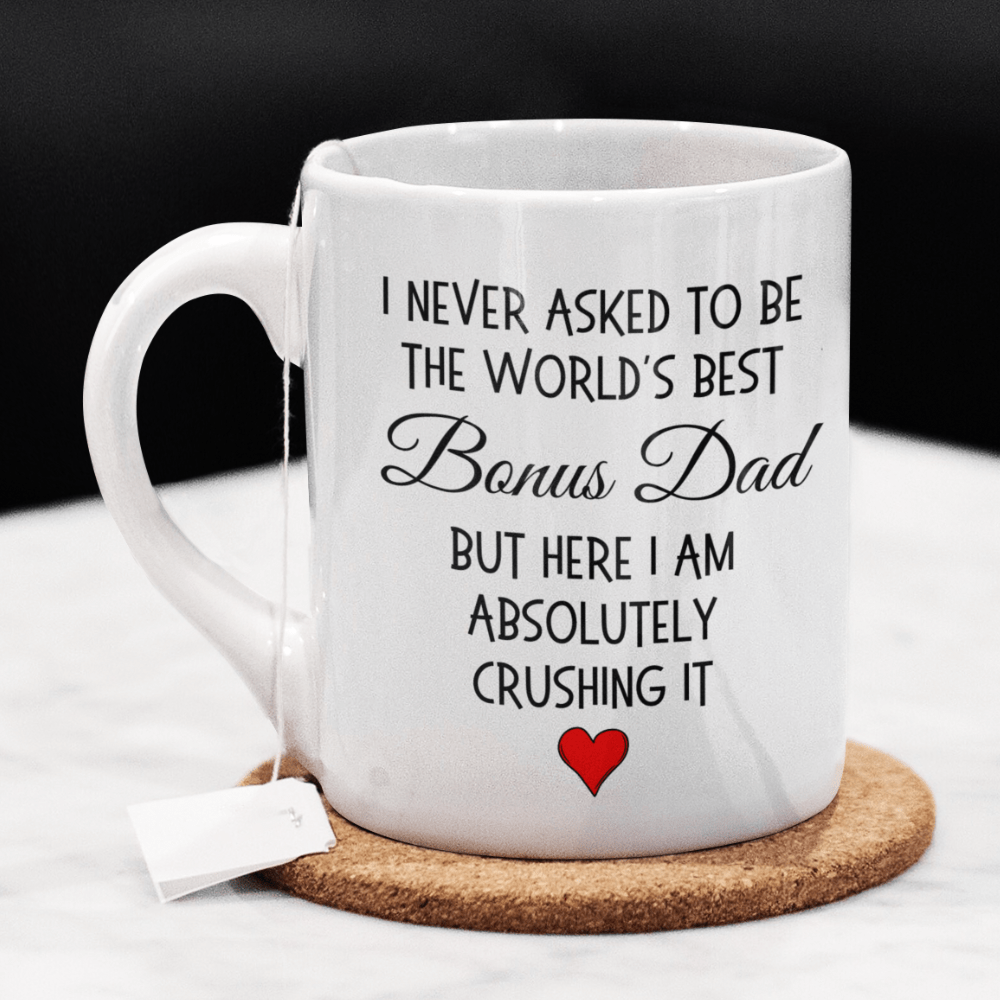 - This mug features a proud declaration that celebrates the remarkable job he’s doing as a bonus dad, perfect for giving him a boost with every sip.