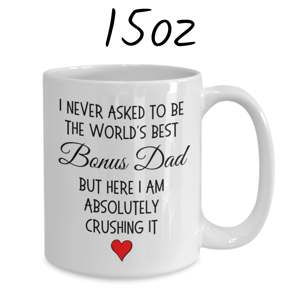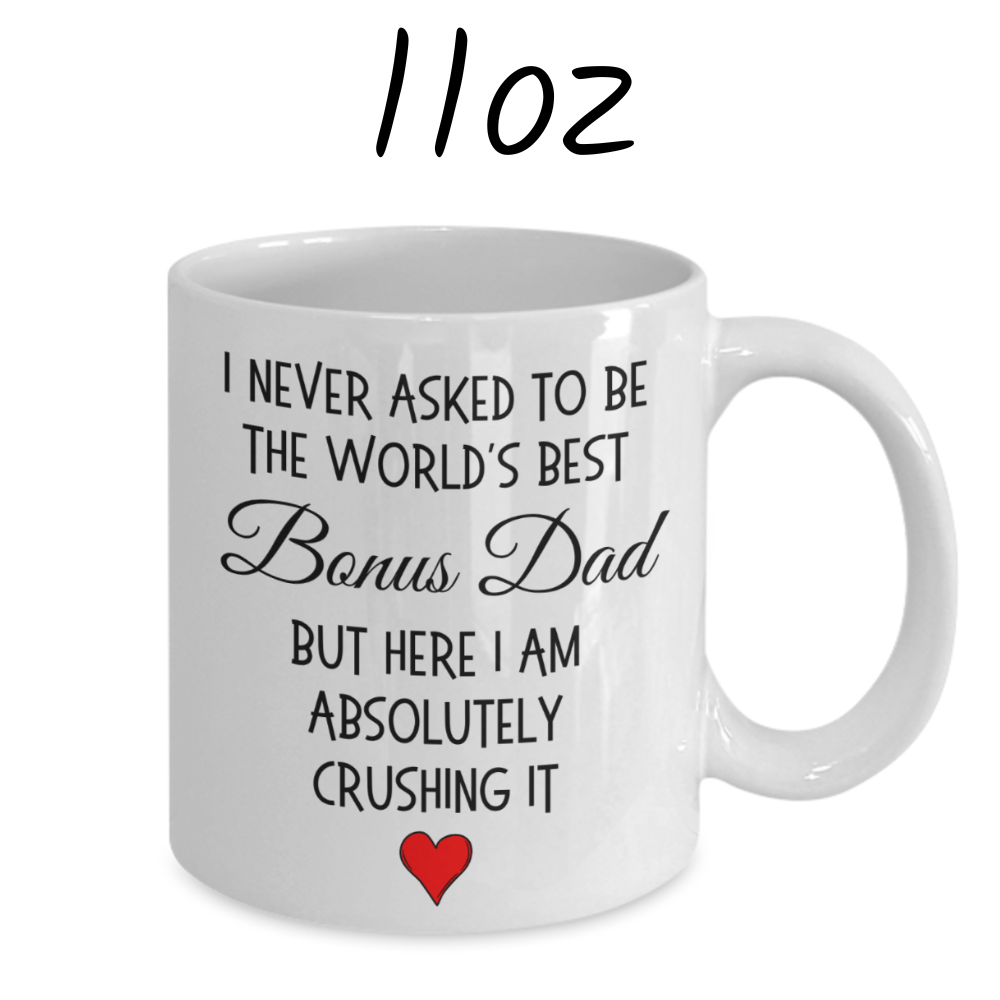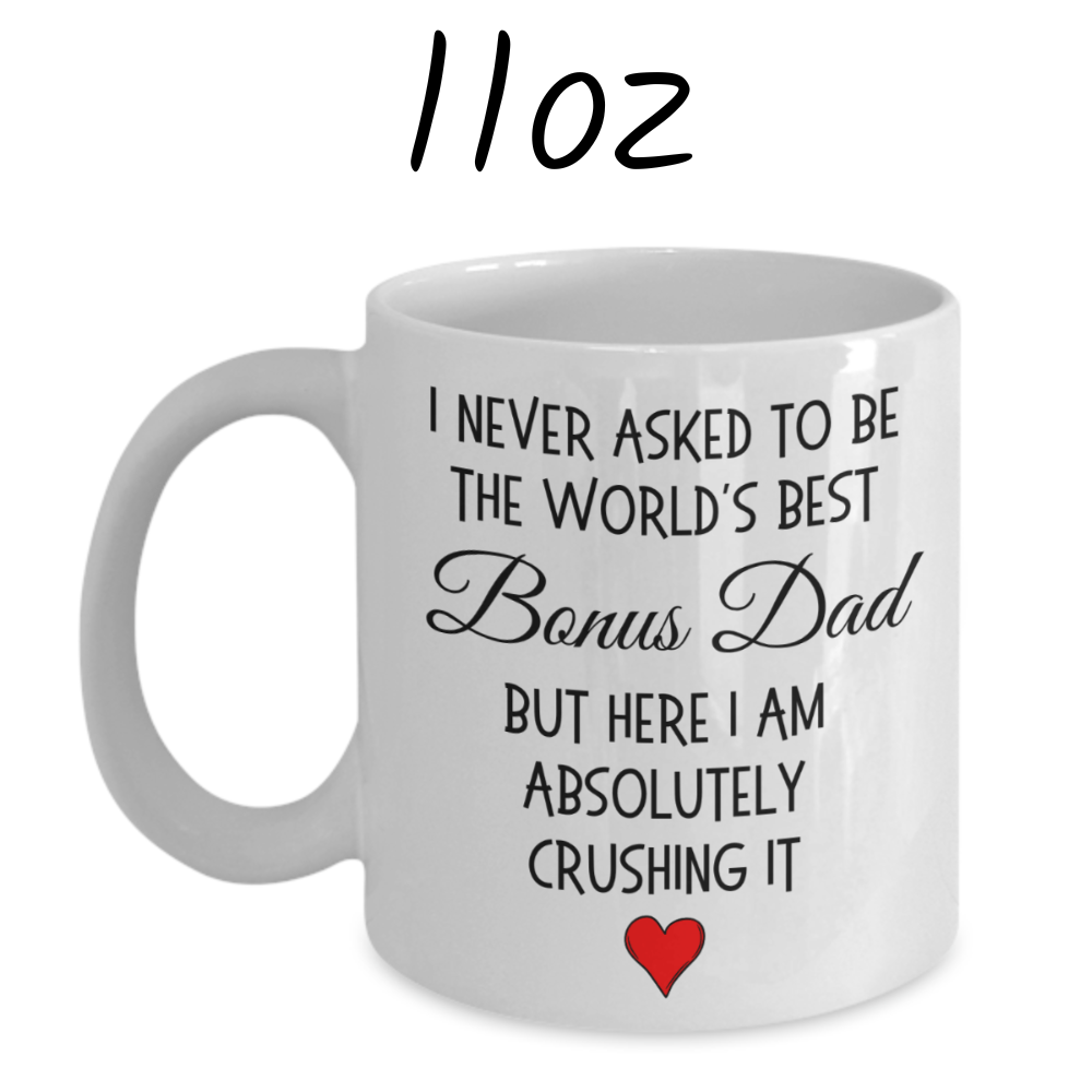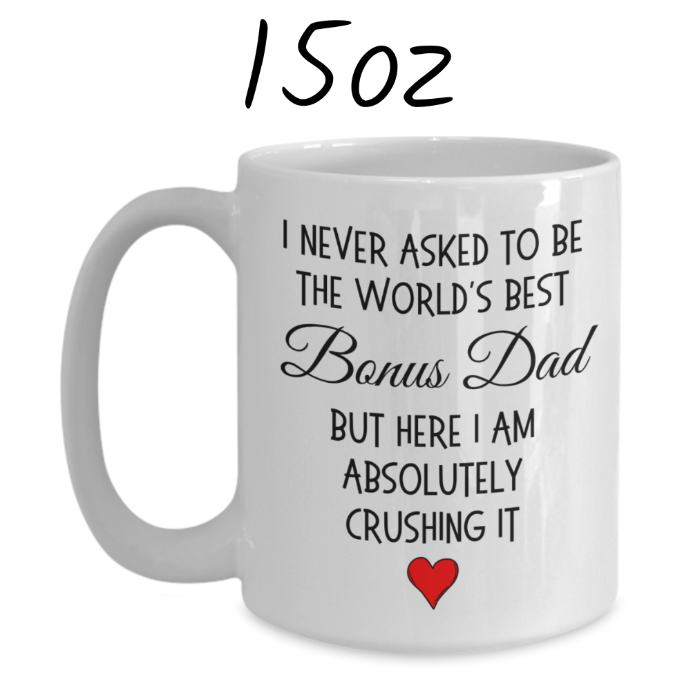 Celebrate your stepdad's awesome role in your life with our bold and humorous coffee mug that proclaims, "I NEVER ASKED TO BE THE WORLD'S BEST BONUS DAD BUT HERE I AM ABSOLUTELY CRUSHING IT." This mug is a perfect tribute to all the amazing bonus dads out there who go above and beyond.