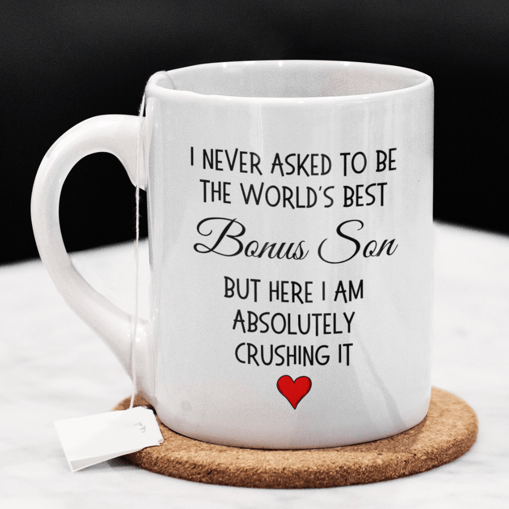 - This mug is for bonus sons who bring joy and pride to their families. It’s a way to say, "You’re doing a great job!" in a fun, loving manner.