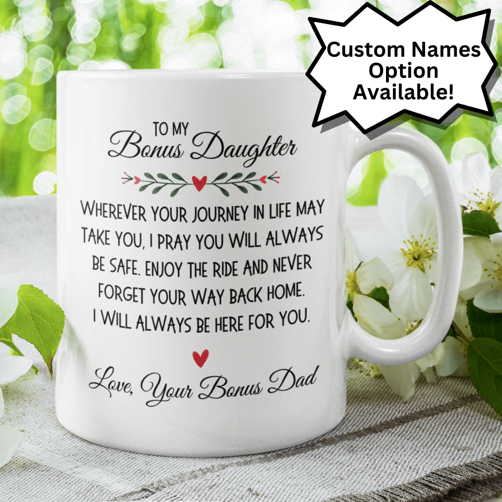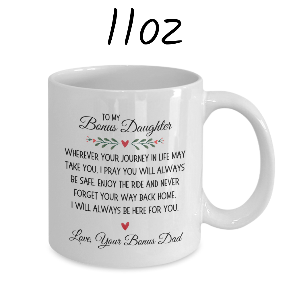 Celebrate the enduring bond with your bonus daughter with this thoughtful white ceramic coffee mug, inscribed with the message, "To my Bonus Daughter, Wherever your journey in life may take you, I pray you will always be safe. Enjoy the ride and never forget your way back home. I will always be here for you. Love, Your Bonus Dad." This mug is a heartfelt reminder of your support and love, perfect for any occasion that celebrates her.