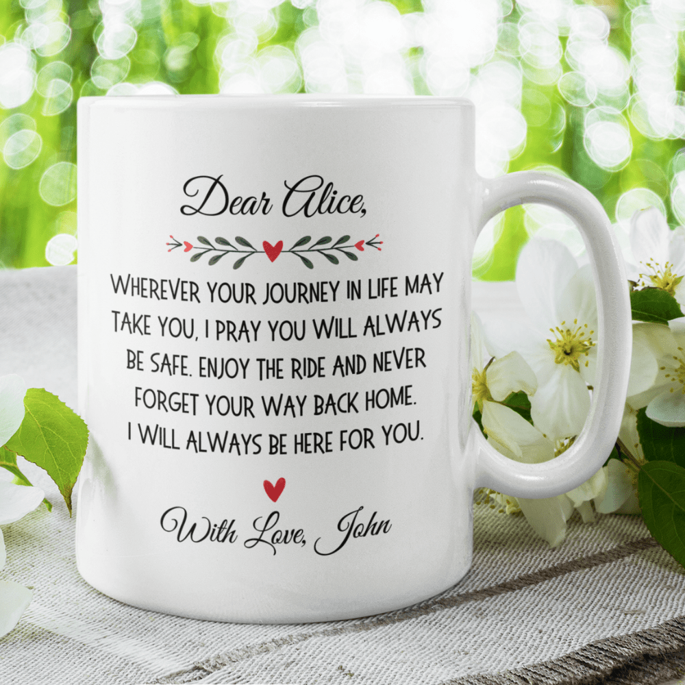 • Option 1: The loving message is featured on both sides of the mug, providing a constant reminder of home and the unwavering support awaiting her.