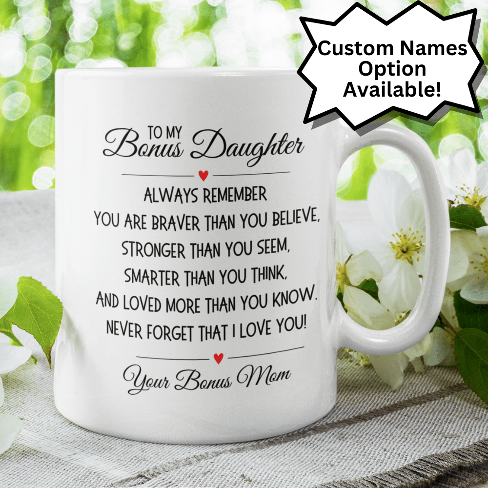 - Option 2: Personalize the mug with your bonus daughter's name and a loving message or name from you, the bonus mom, creating a truly unique and personal gift.