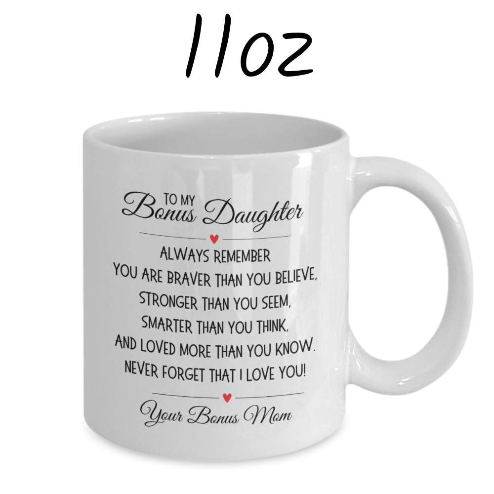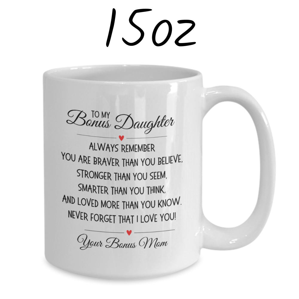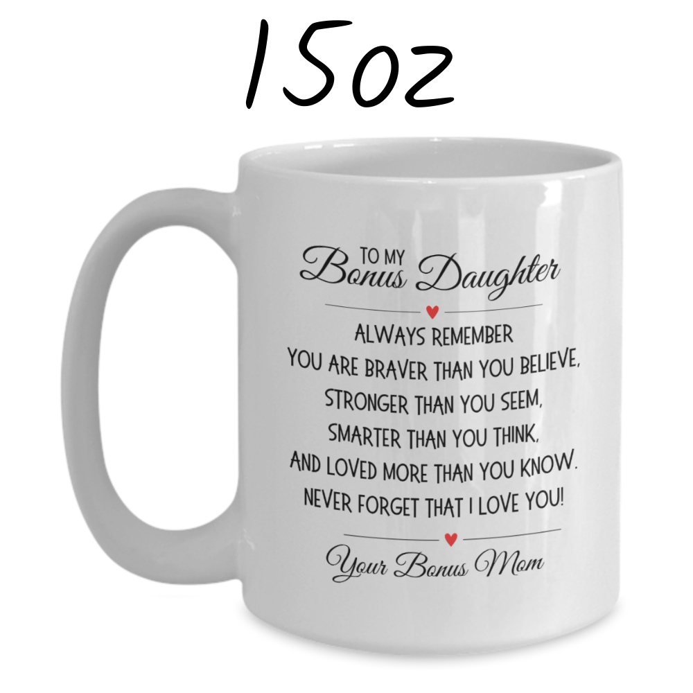 Celebrate the heartfelt connection with your bonus daughter with this beautifully designed white ceramic coffee mug that says, "To my Bonus Daughter, Always remember you are braver than you believe, stronger than you seem, smarter than you think, and loved more than you know. Never forget that I love you! Your Bonus Mom." This mug is a perfect way to express your love and admiration, making it a wonderful gift for any special occasion.