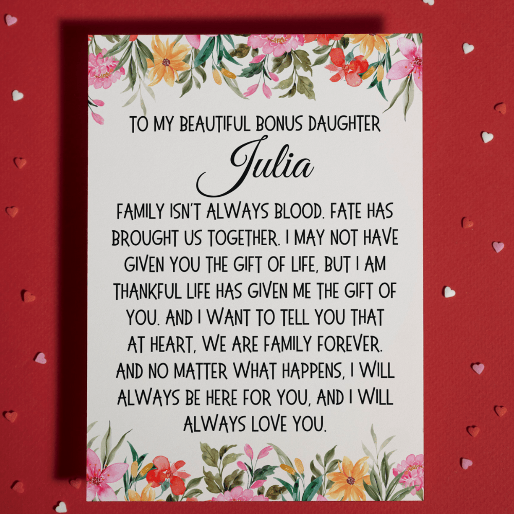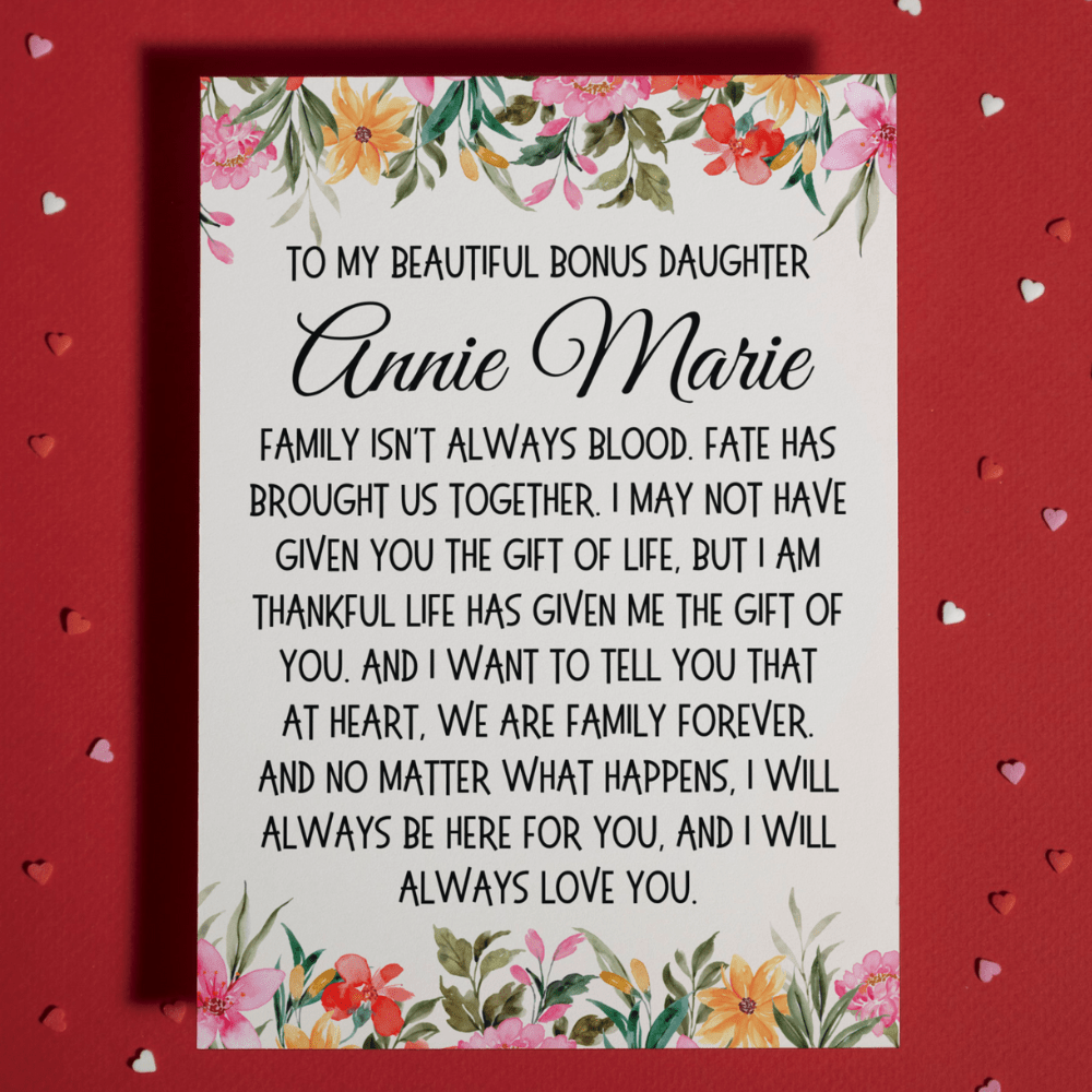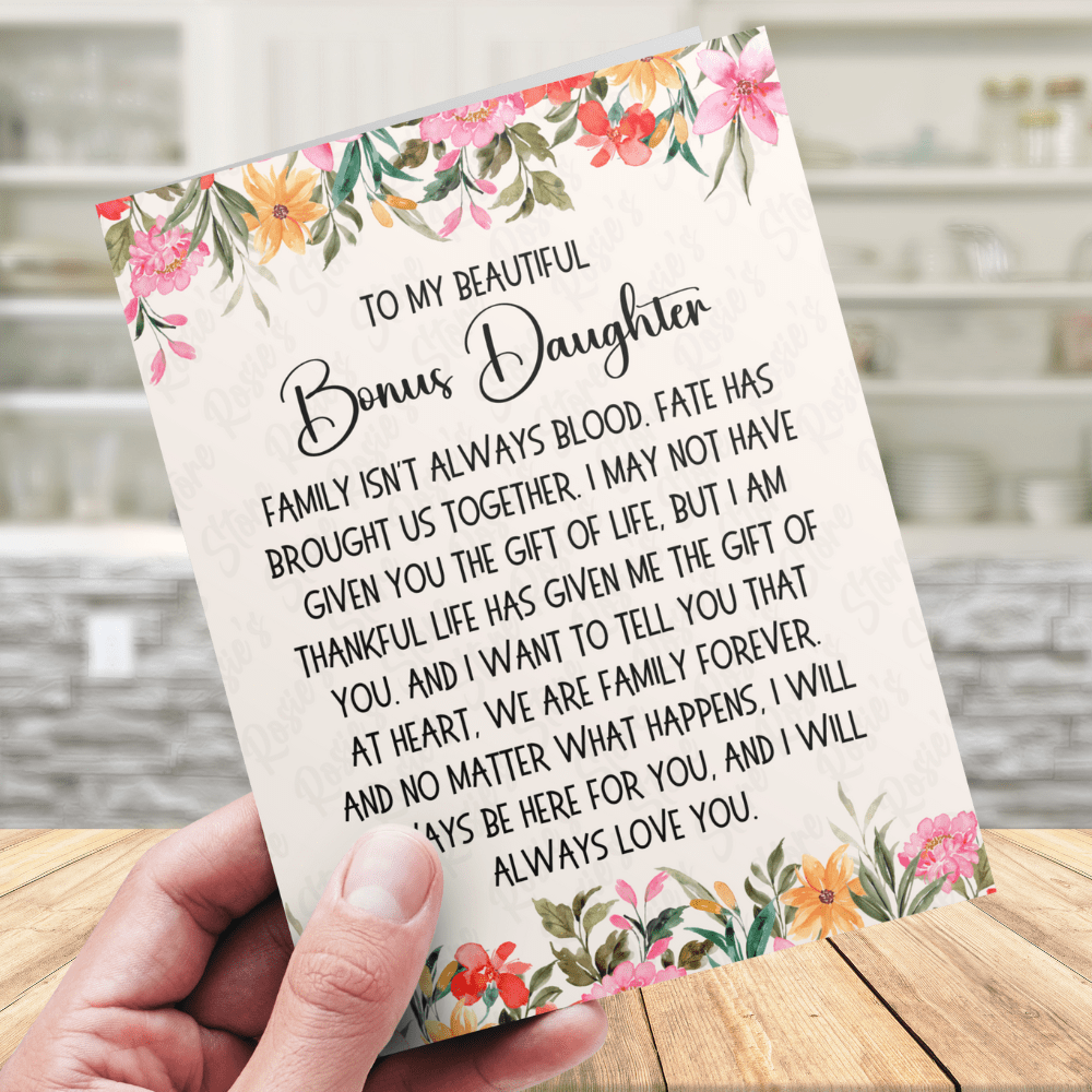 Introducing our heartfelt greeting card for a bonus daughter: "To my beautiful bonus Daughter. Family isn't always blood. Fate has brought us together. I may not have given you the gift of life, but I am thankful life has given me the gift of you. And I want to tell you that at heart, we are family forever. And no matter what happens, I will always be here for you, and I will always love you."