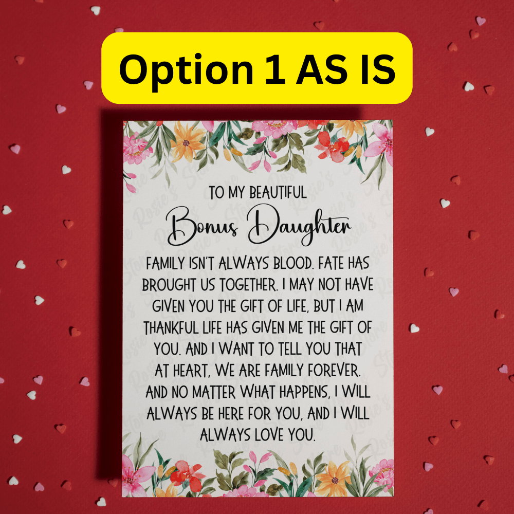 This card comes with two options: Option 1 AS IS or Option 2, which can be customized with your bonus daughter's name for a truly personal touch.