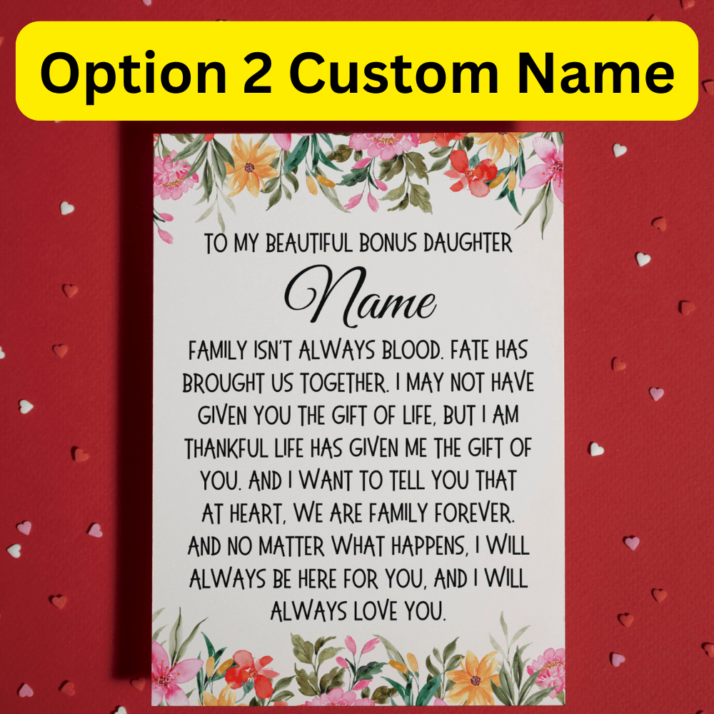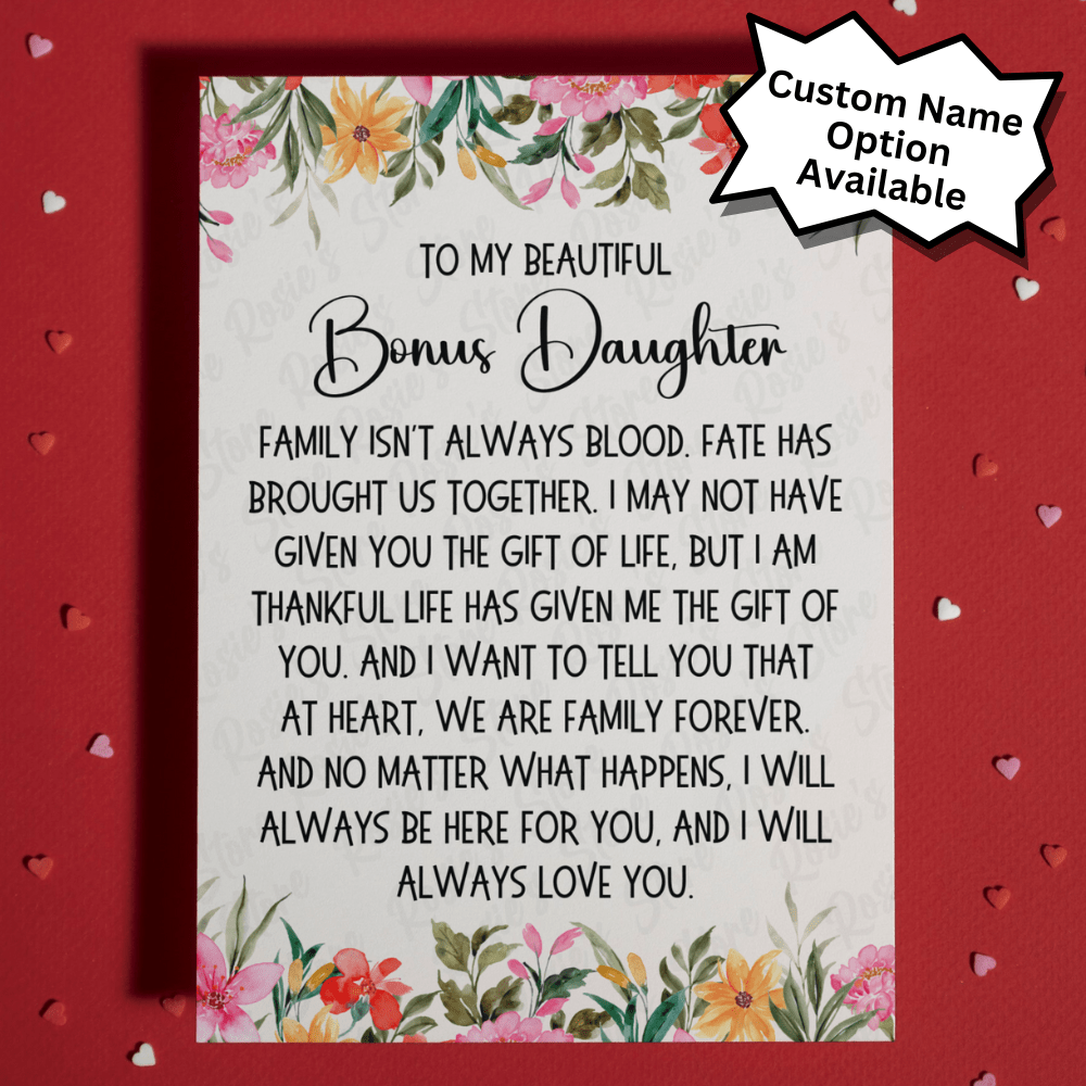 Perfect for special occasions such as birthdays, Valentine's Day, or as an adoption card, this card is a meaningful gift for your bonus daughter or stepdaughter. Whether from a stepdad or stepmom, this card is a thoughtful way to express love and gratitude in a blended family.