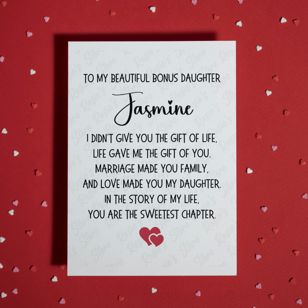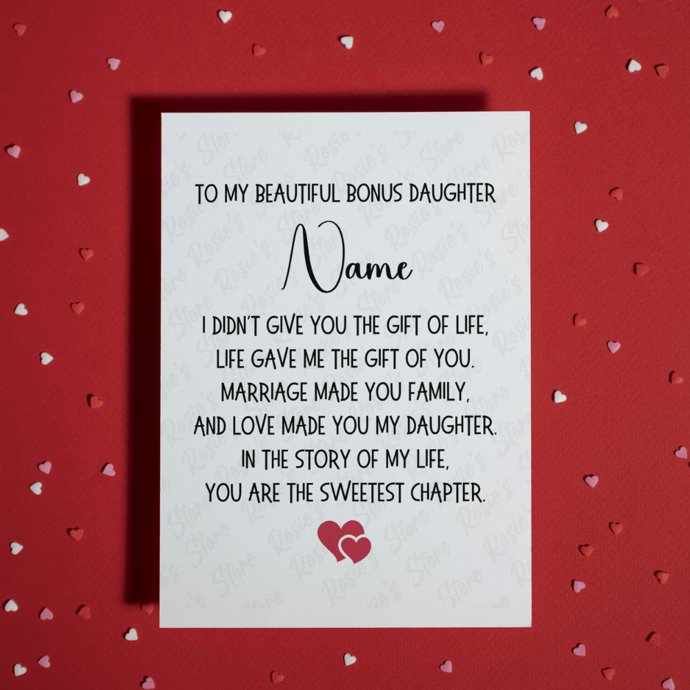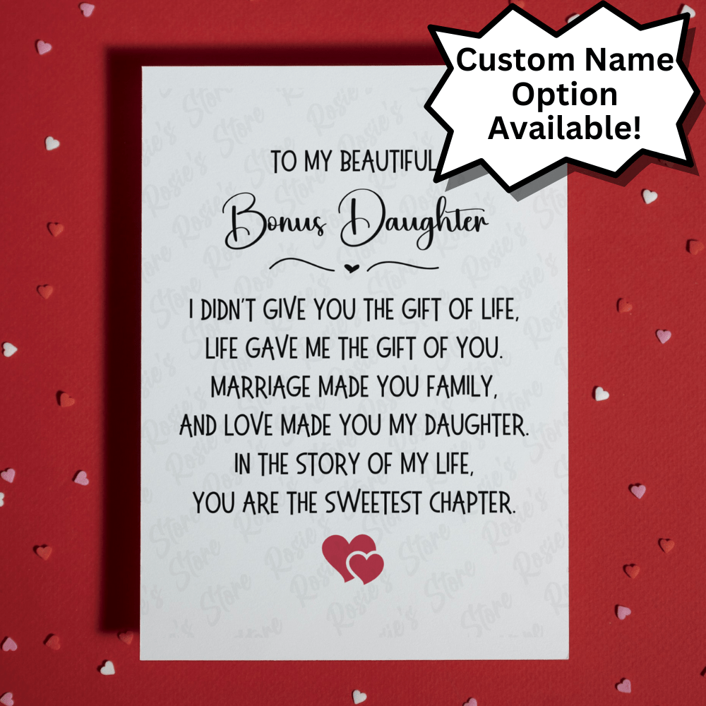 Celebrate your unique family bond with this heartfelt and customizable greeting card for your bonus daughter. Perfect for birthdays, holidays, or any occasion. Order now and show her how much she means to you! 🌟💖👩👧👦