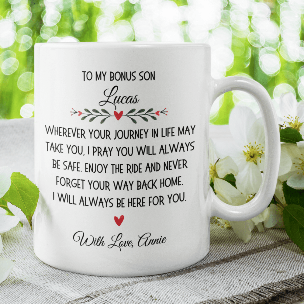 Gift your bonus son a daily dose of love and inspiration with our heartfelt white ceramic coffee mug, beautifully inscribed with the message: "TO MY BONUS SON. WHEREVER YOUR JOURNEY IN LIFE MAY TAKE YOU, I PRAY YOU WILL ALWAYS BE SAFE. ENJOY THE RIDE AND NEVER FORGET YOUR WAY BACK HOME. I WILL ALWAYS BE HERE FOR YOU. LOVE, YOUR BONUS MOM." This mug is a constant reminder of the special bond and unwavering support you offer him.