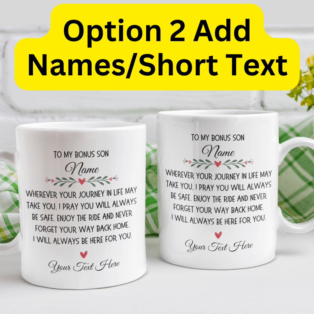 - Option 2: Personalize the mug by adding your bonus son's name and replacing "Love, your bonus mom" with your own short text, making it an exceptionally personal gift.