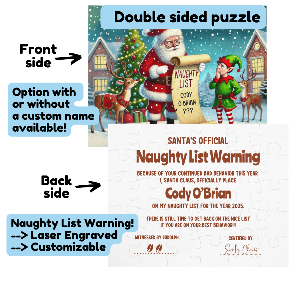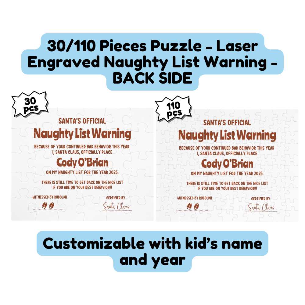 Christmas Gift, Double-sided Puzzle with Laser Engraved Naughty List Warning From Santa Claus