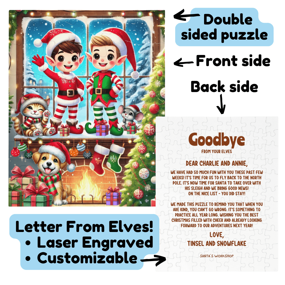 Create a new holiday tradition with our Double-Sided Jigsaw Puzzle – Goodbye or Hello Letter from Your Elf/Elves! 💌 This isn't just any elf puzzle; it's a unique and enchanting way to mark the beginning or end of the festive season.