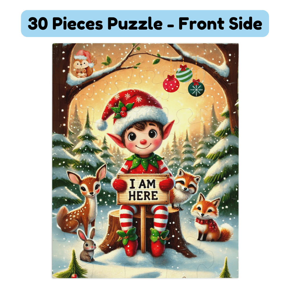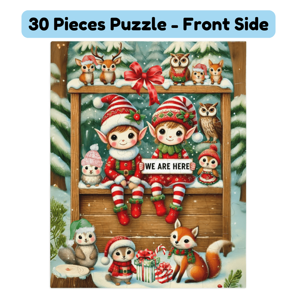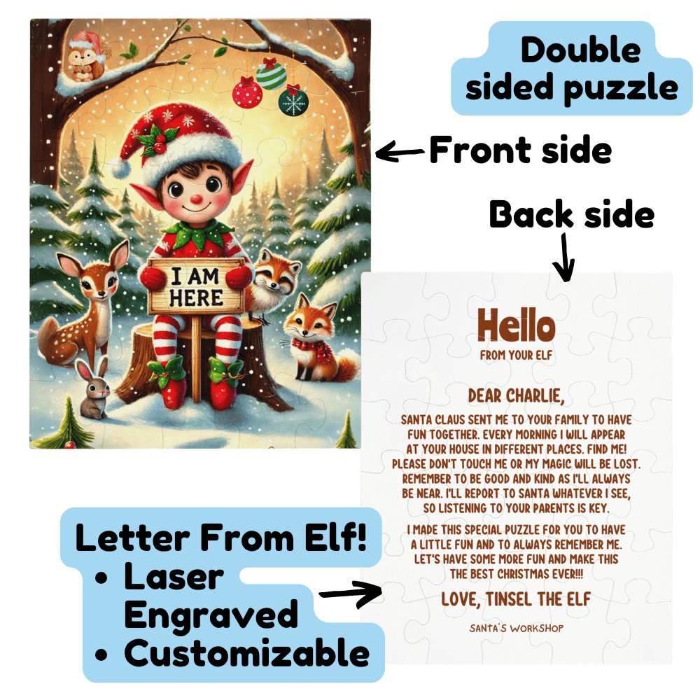 Get ready for a holiday adventure with our delightful Christmas double-sided jigsaw puzzle! On one side, you'll find an adorable picture of an elf or two elves (your choice), while the other side reveals a heartfelt letter from the elf(s) to your child(ren).