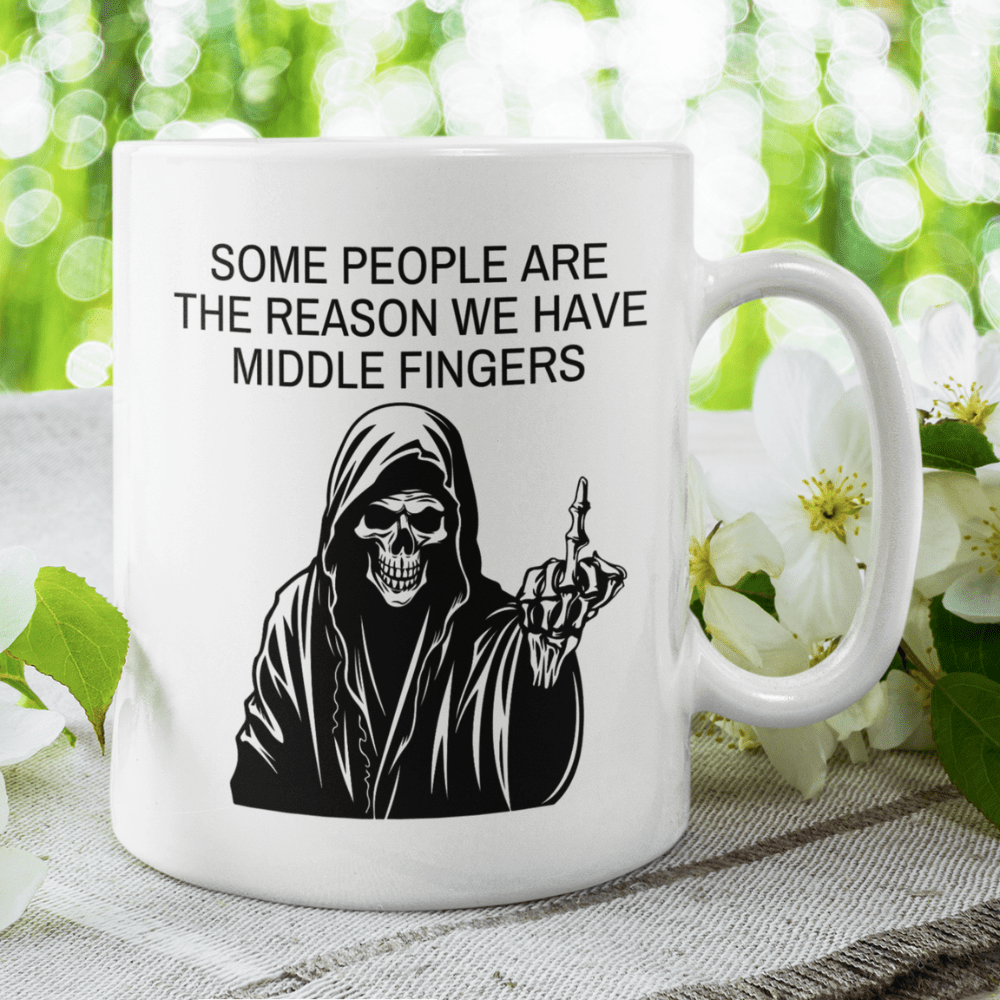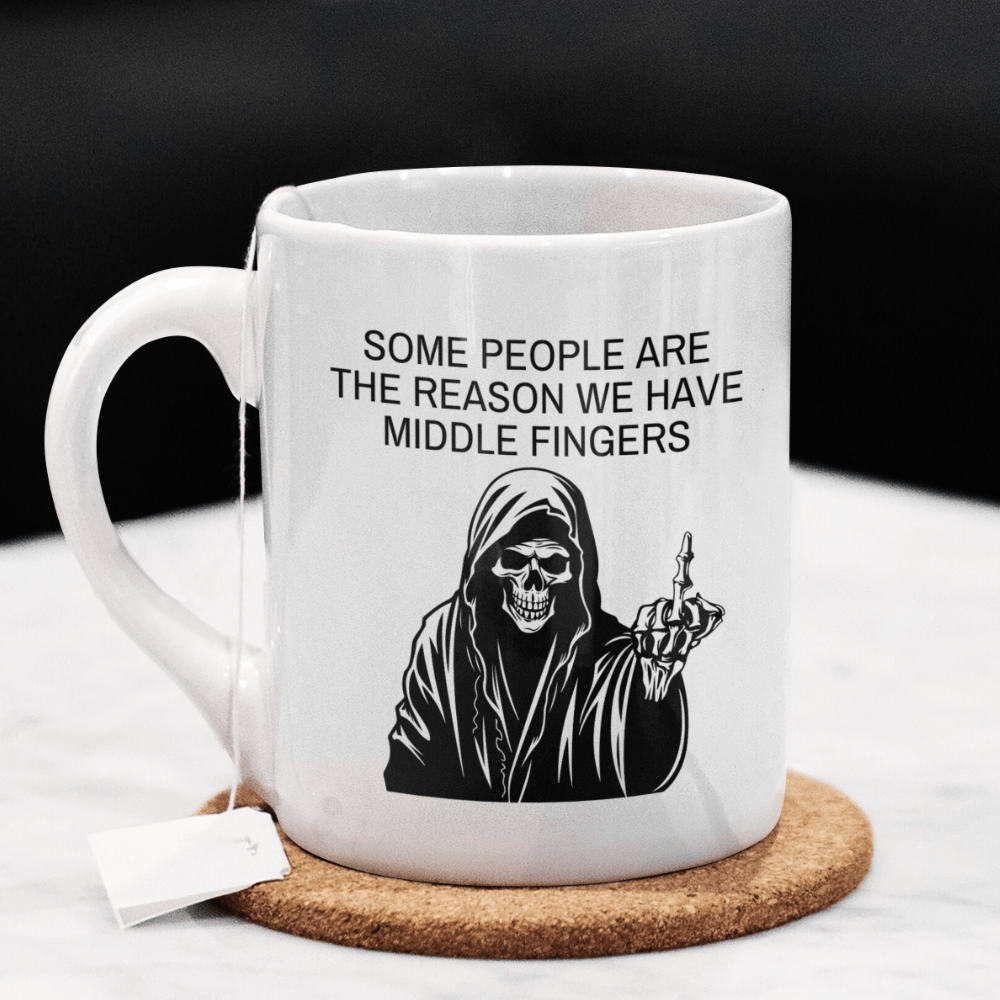 Looking for a hilarious and slightly sarcastic addition to your mug collection? Look no further than our white ceramic coffee mug featuring a cartoon drawing of the Grim Reaper showing a middle finger, alongside the caption "Some people are the reason we have middle fingers"