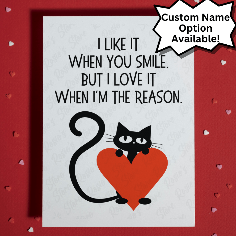 • Front Cover: Features the sweet and affectionate message, "I like it when you smile. But I love it when I'm the reason," alongside an adorable cartoon drawing of a black cat holding a big red heart in its paws.