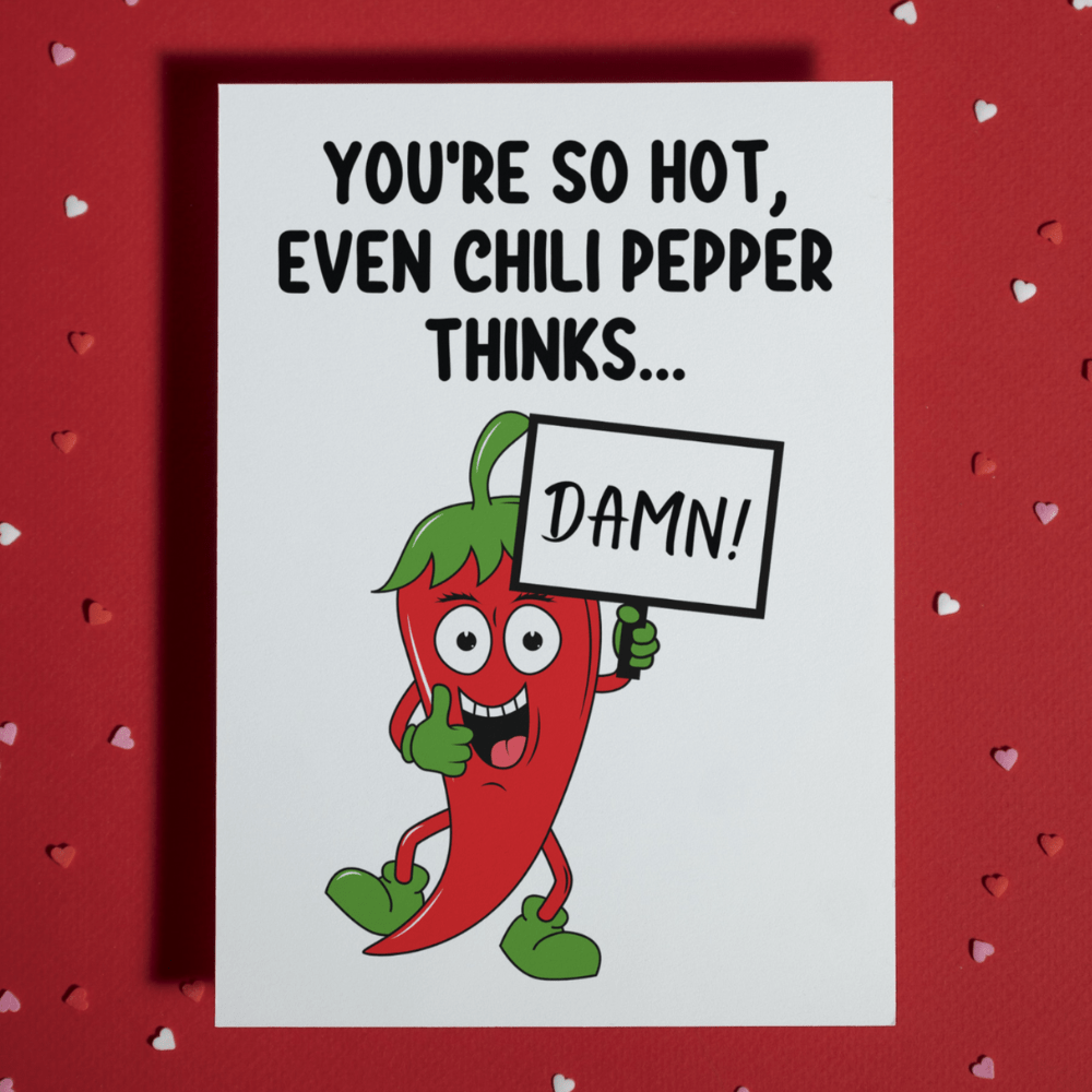 Spice up someone's day with our sizzling greeting card! Our "You're so hot, even chili pepper thinks...DAMN!" card is the perfect way to add a touch of humor and flattery to let someone know just how smokin' they are.