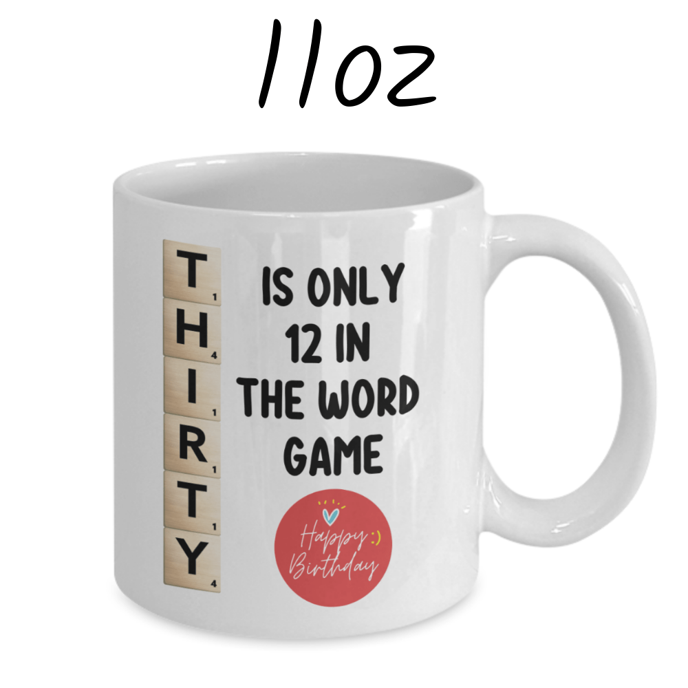 Make the 30th birthday memorable with our "Thirty is Only 12 in the Word Game" coffee mug. Order now and let the celebrations begin with a touch of humor and a whole lot of style!