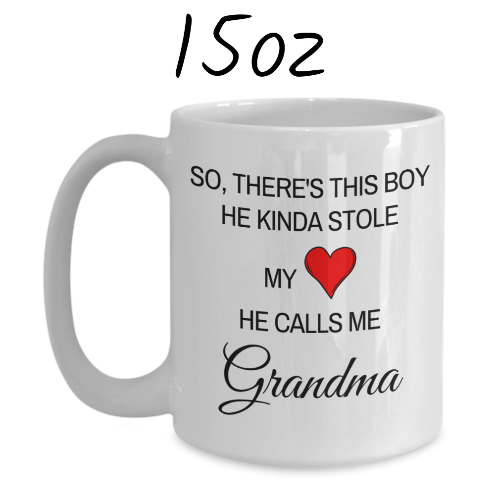 Celebrate the special bond between grandma and grandson with our delightful white ceramic coffee mug. The front side features the touching message: "So, there's this boy he kinda stole my heart. He calls me Grandma".ย But you can customize 'Grandma' with another title like Nana, Gigi, Grandmother, or any other name that's dear to your heart.