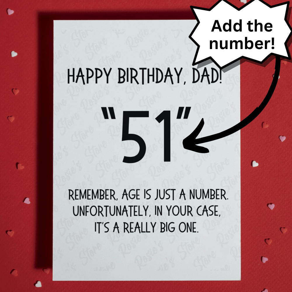 - Front Cover: Features the funny and affectionate message, "Happy birthday, Dad! 'Age number' Remember, age is just a number. Unfortunately, in your case, it's a really big one." This playful statement is sure to bring laughter and joy to your dad on his birthday.
