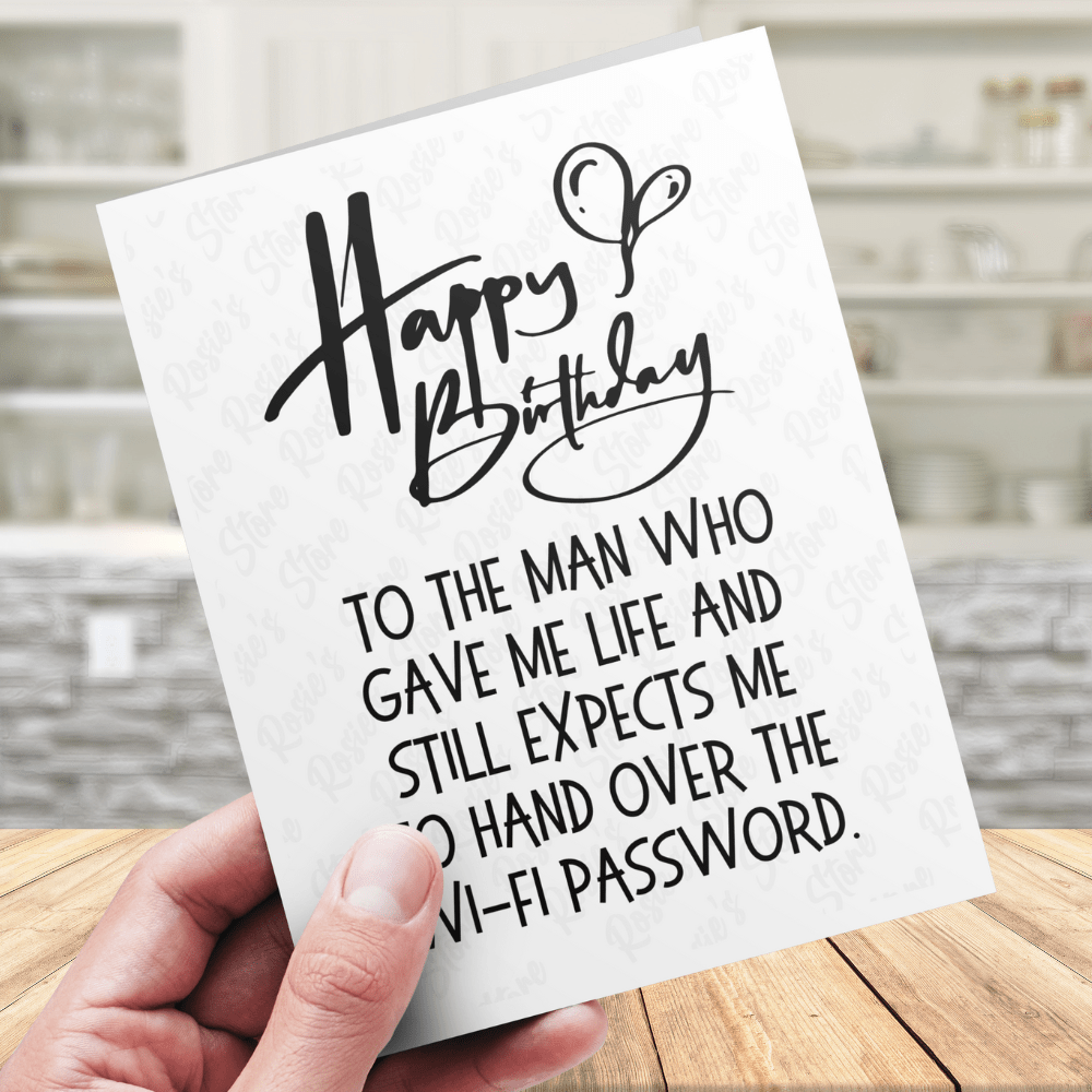 - Front Cover: Features the funny and endearing message, "Happy Birthday to the man who gave me life and still expects me to hand over the Wi-Fi password." This playful statement highlights the timeless bond between you and your dad, updated with a modern twist.