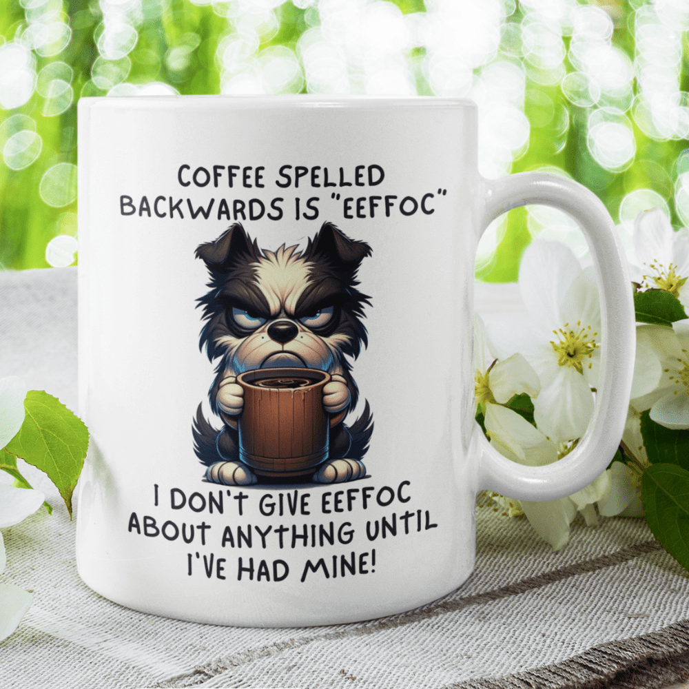 Funny and Clever Design 😄 This mug boasts the amusing message: "Coffee spelled backwards is 'eeffoc'. I don't give eeffoc about anything until I've had mine!" It's a playful twist on the importance of coffee in our lives, guaranteed to make you chuckle every time you reach for your favorite brew.