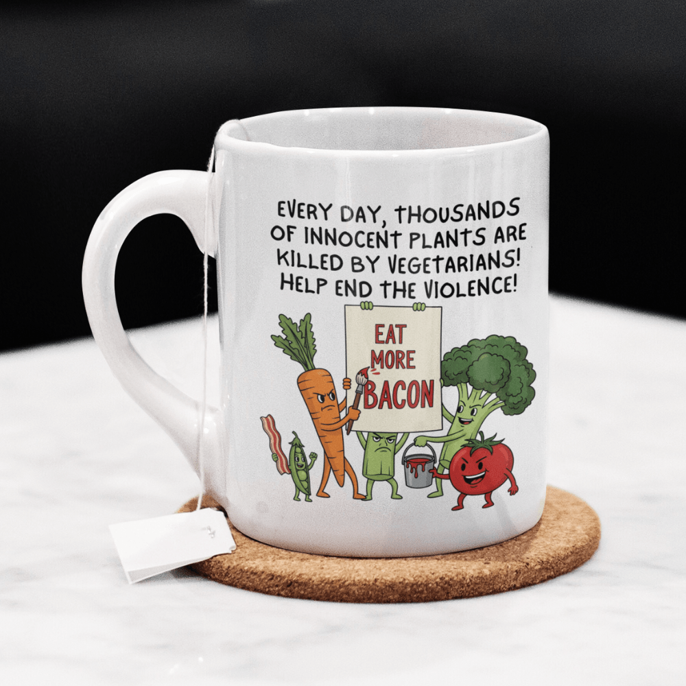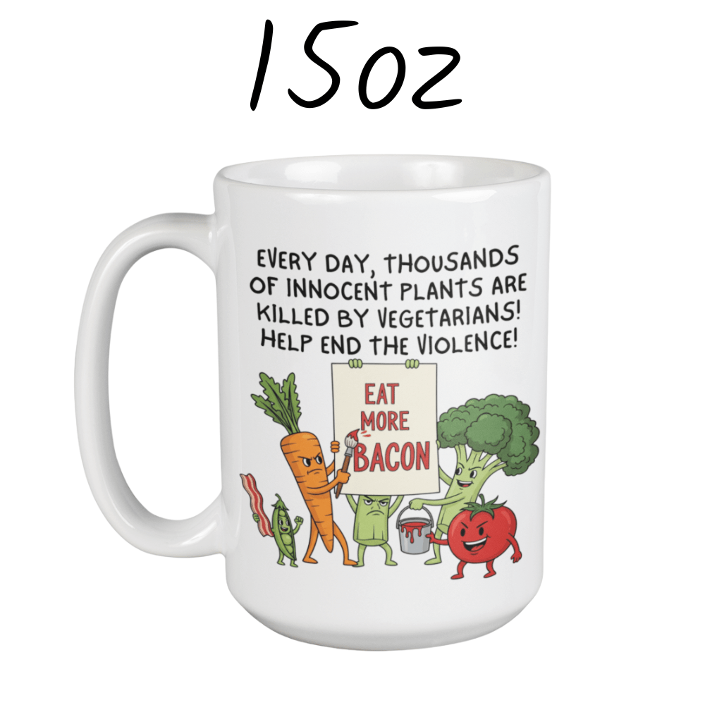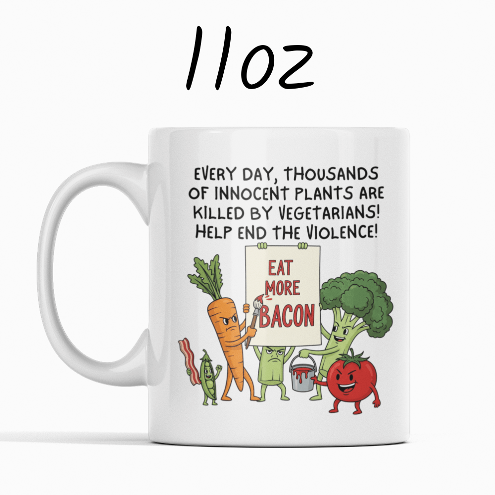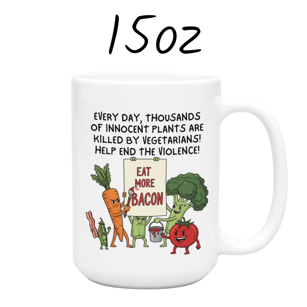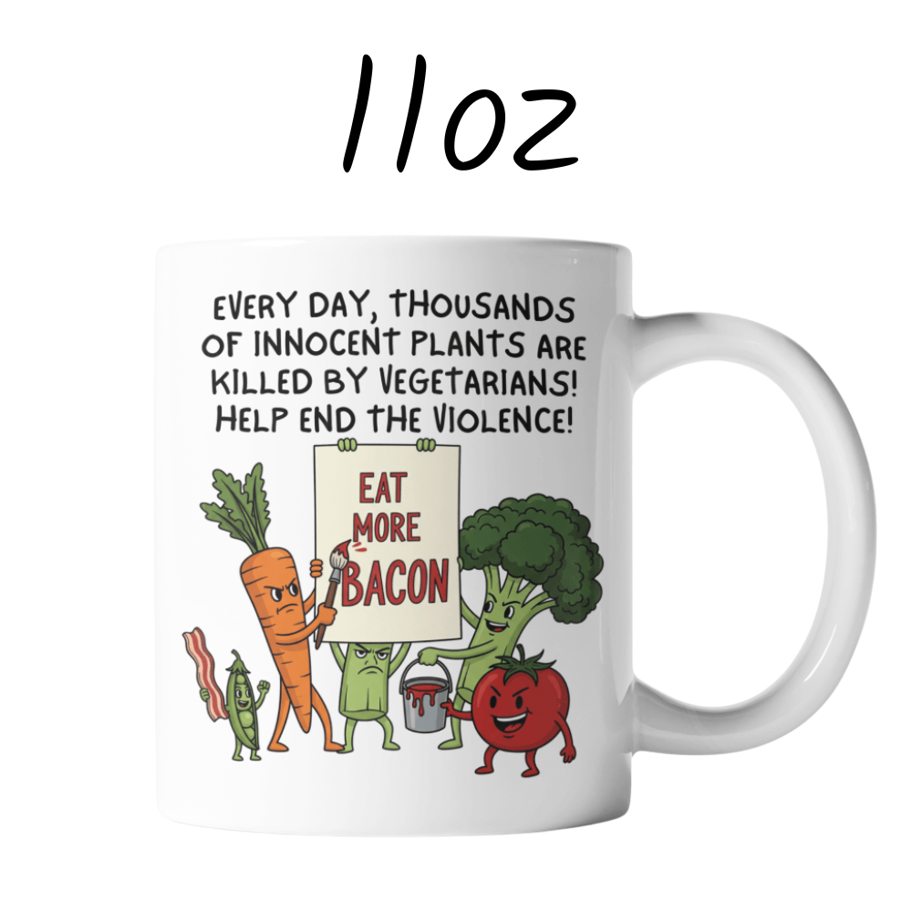Start your day with a side of laughter with our funny white ceramic coffee mug! Featuring the cheeky message: "Every day, thousands of innocent plants are killed by vegetarians! Help end the violence!" and adorned with an adorable cartoon drawing of vegetables making a poster that says "EAT MORE BACON", this mug is guaranteed to tickle your funny bone.