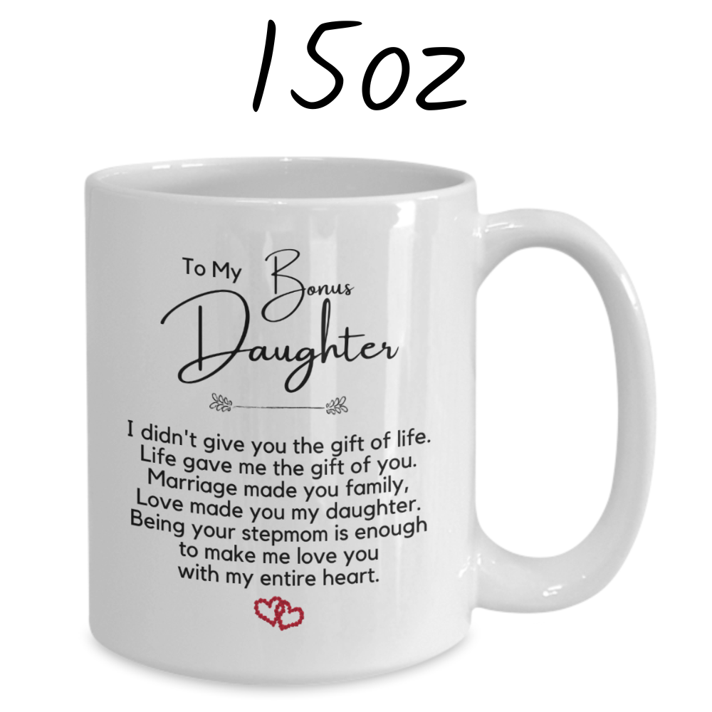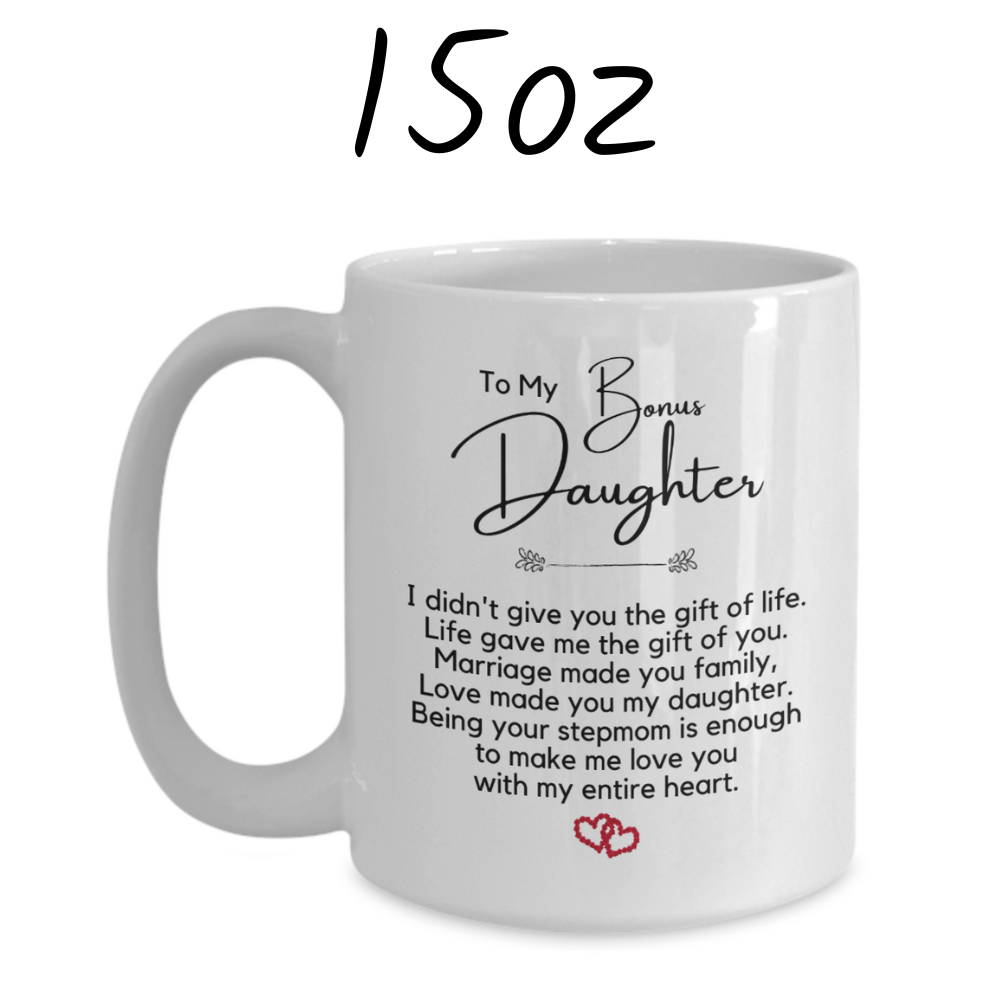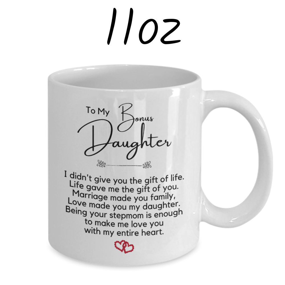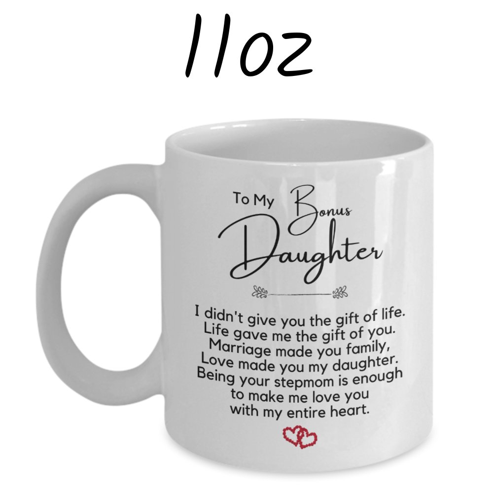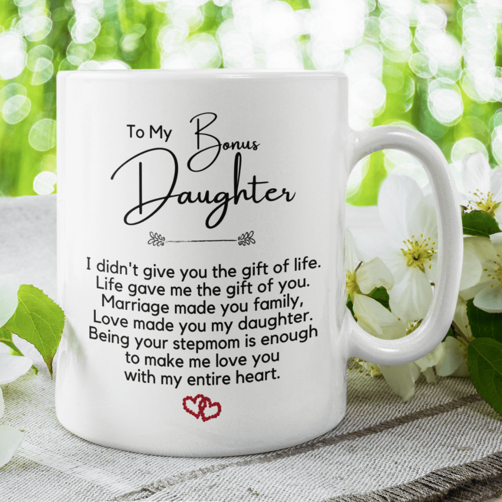 Celebrate the unique connection you share with your bonus daughter through the thoughtful and sentimental gift of our white ceramic coffee mug. Each sip becomes a moment to cherish the beautiful journey of family, love, and the joy of having her in your life.