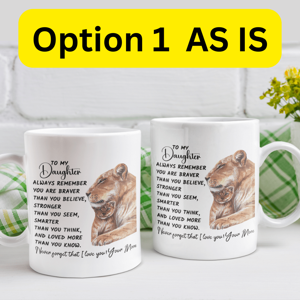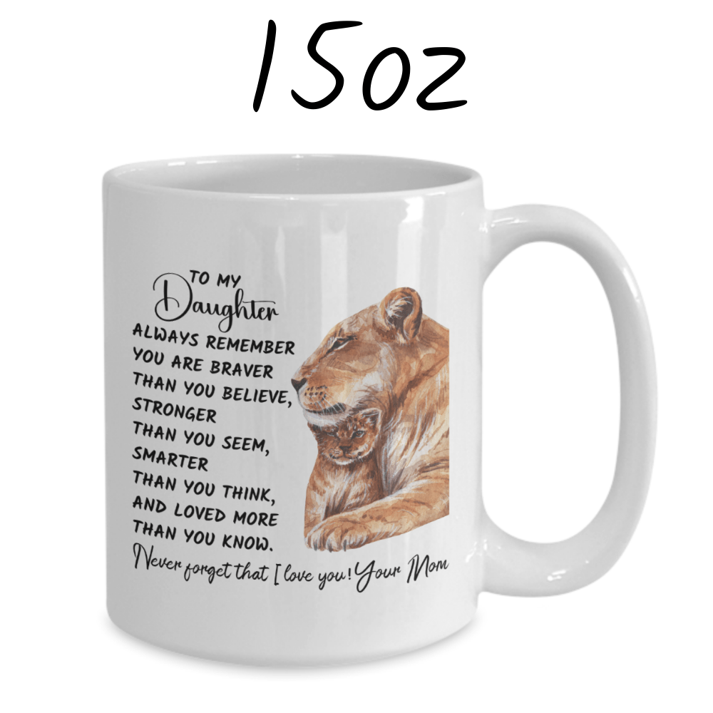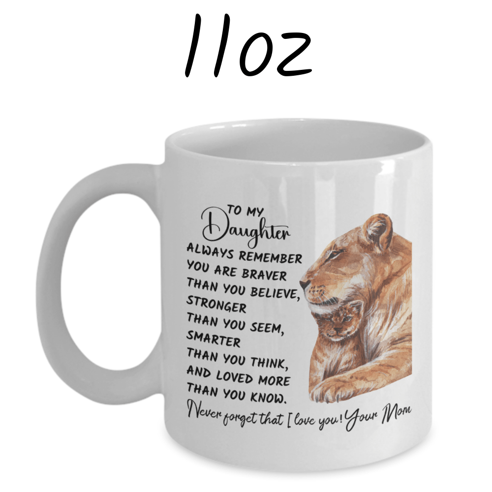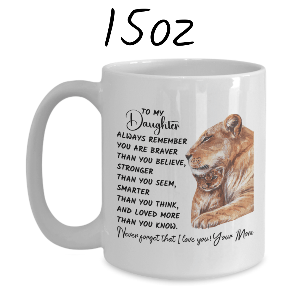 The front and back of the mug reads "To my Daughter Always remember you are braver than you believe, stronger than you seem, smarter than you think, and loved more than you know. Never forget that I love you! Your Mom" These uplifting words serve as a constant reminder of your daughter's inner strength and the boundless love you have for her.