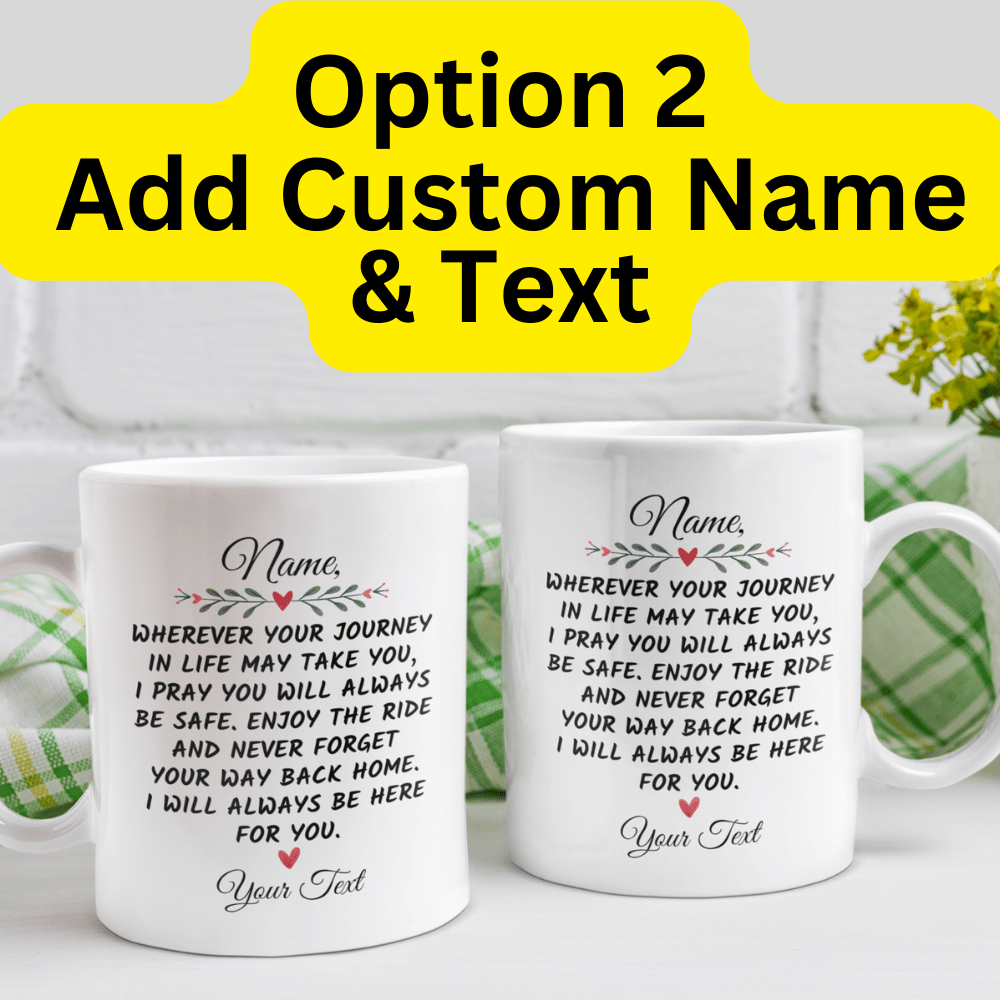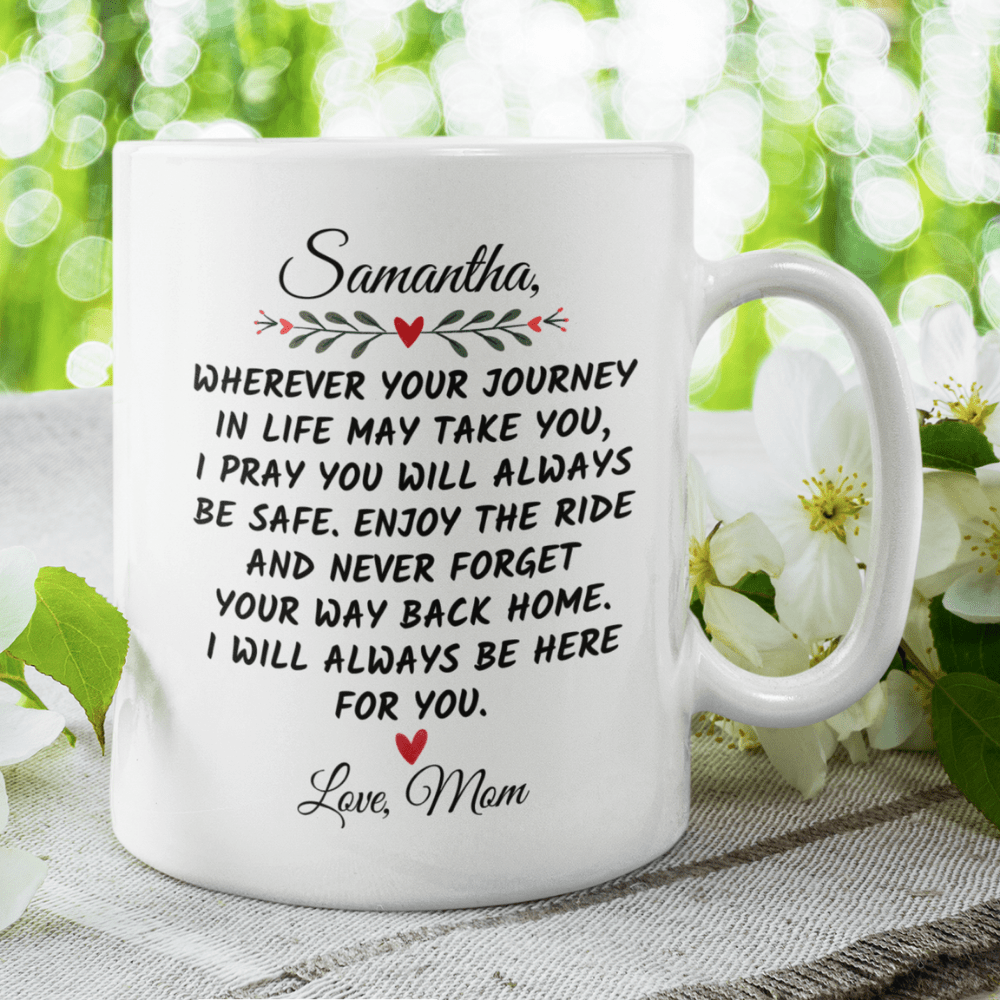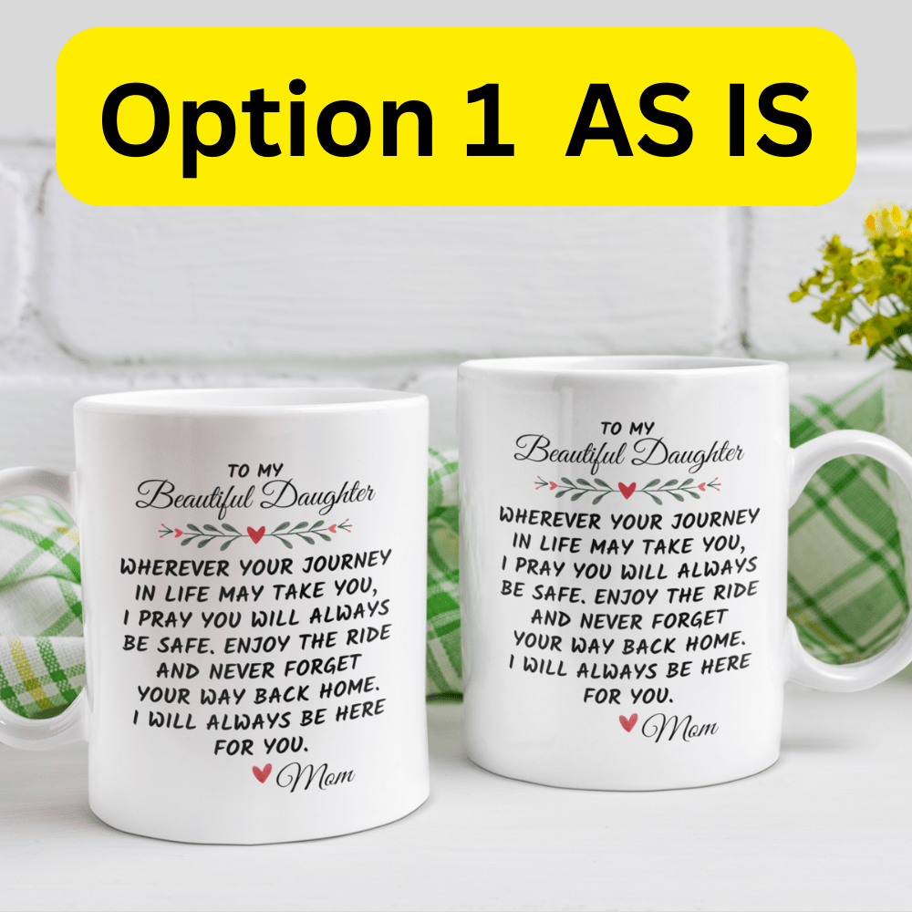 The front and back of the mug reads "To my Beautiful Daughter Wherever your journey in life may take you, I pray you will always be safe. Enjoy the ride and never forget your way back home. I will always be here for you. Mom" These touching words encapsulate a mother's love and desire for her daughter's happiness and well-being.