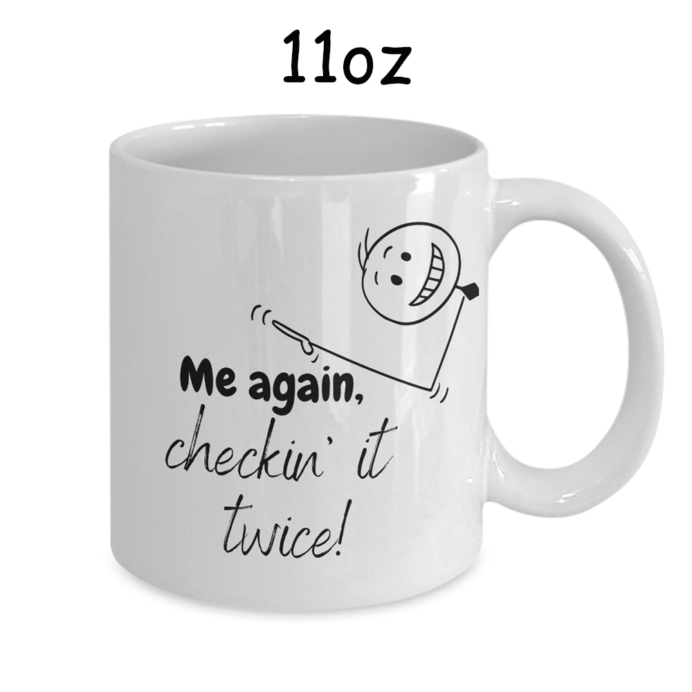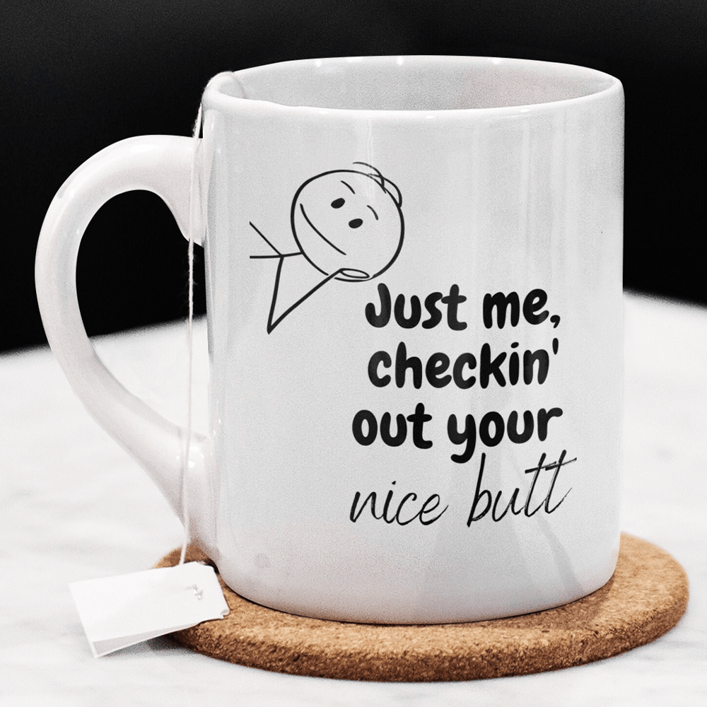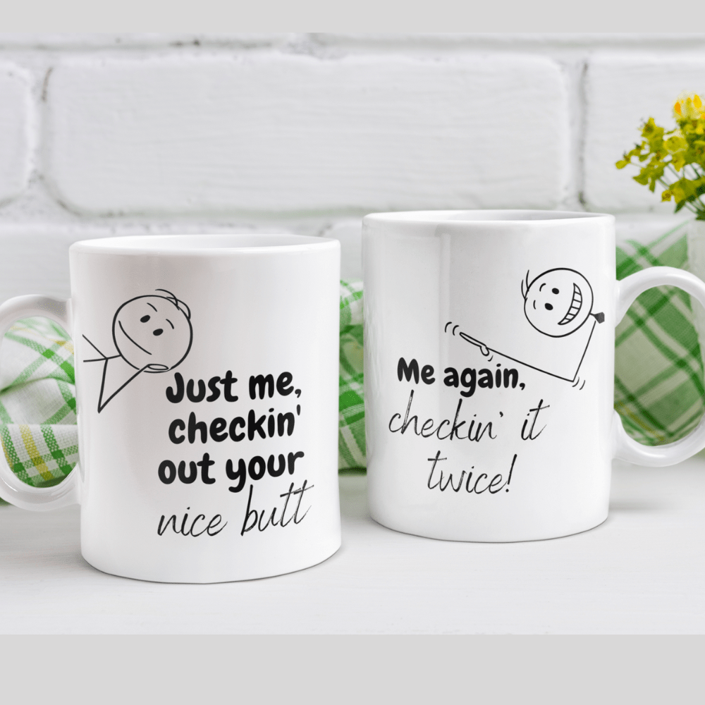 Double-Sided Design: The front side of the mug features the endearing phrase, "Just me, checkin' out your nice butt," while the back side completes the playful exchange with the witty response, "Me again, checkin' it twice!" This delightful design ensures a smile with every sip.