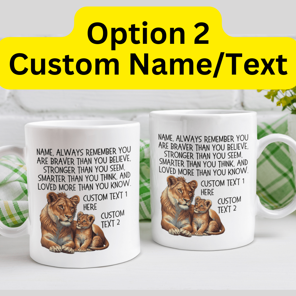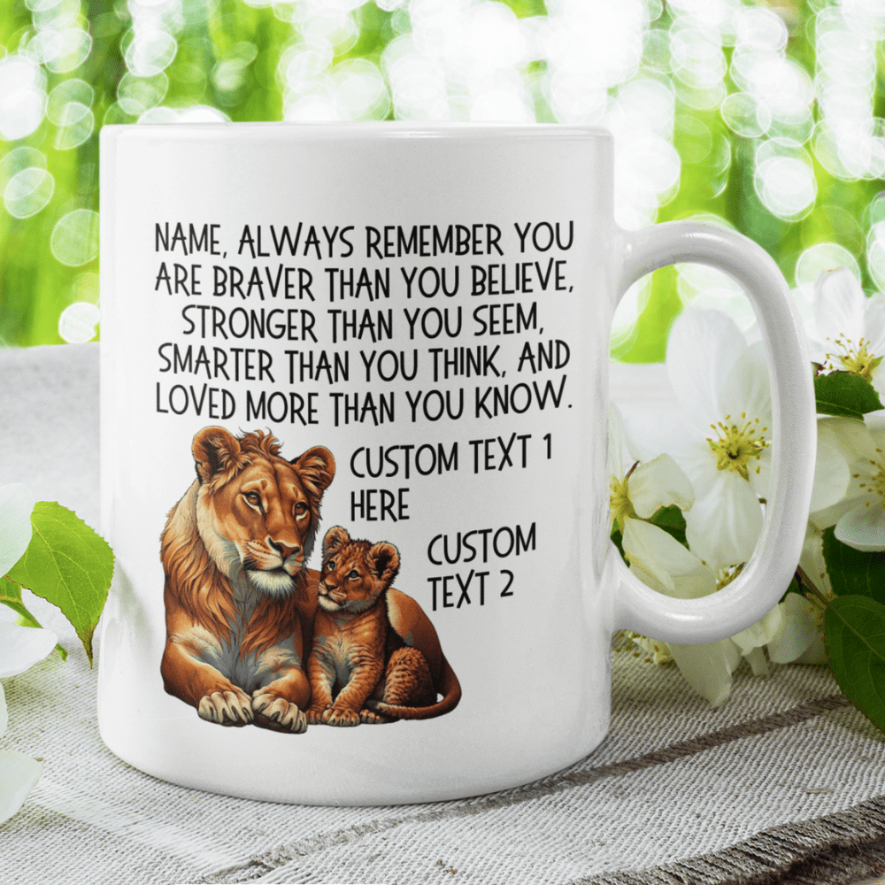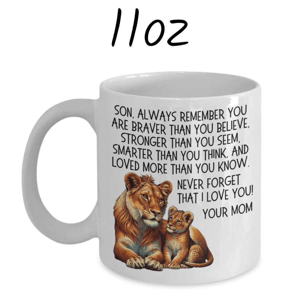Present your son with a symbol of strength and love with our white ceramic coffee mug, inscribed with the empowering message, "Son, always remember you are braver than you believe, stronger than you seem, smarter than you think, and loved more than you know. Never forget that I love you! Your Mom". This mug features a tender illustration of a lioness and her cub, capturing the protective and nurturing essence of a mother's love.