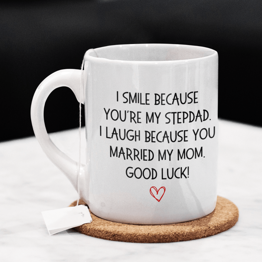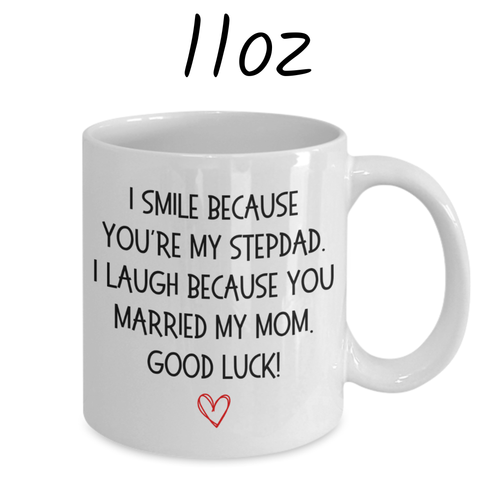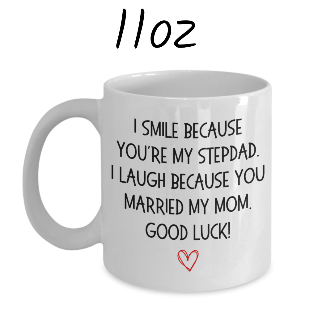 Bring a smile to your stepdad's face with our humorous white ceramic coffee mug that says, "I smile because you're my Stepdad. I laugh because you married my mom. Good luck!" This playful mug is the perfect blend of fun and affection, making it a great gift for any occasion.