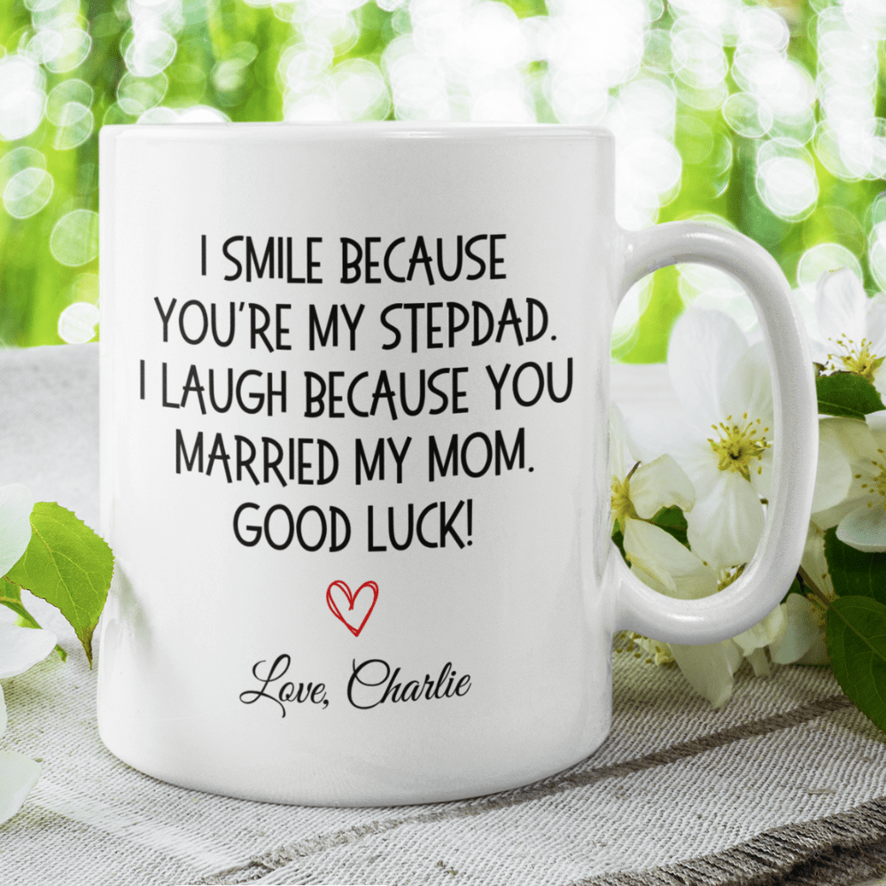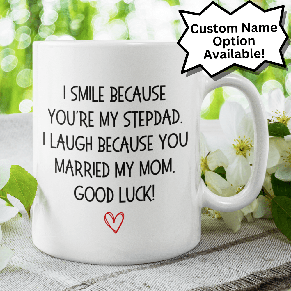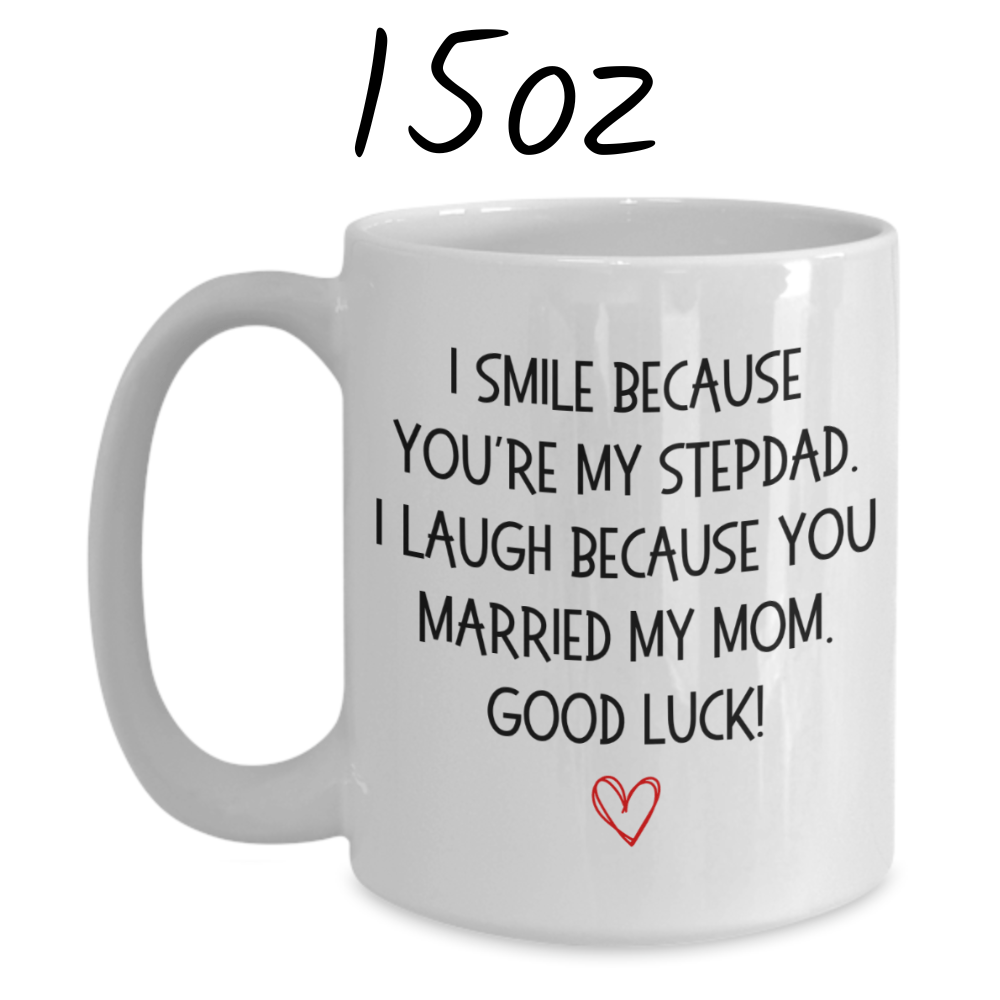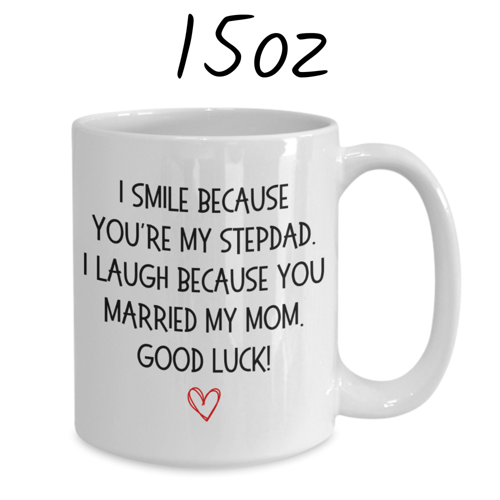 Bring a smile to your stepdad's face with our humorous white ceramic coffee mug that says, "I smile because you're my Stepdad. I laugh because you married my mom. Good luck!" This playful mug is the perfect blend of fun and affection, making it a great gift for any occasion.
