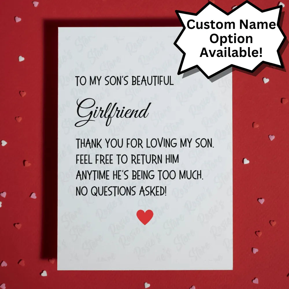 - Front Cover: The card warmly greets, "To my son's beautiful girlfriend. Thank you for loving my son. Feel free to return him anytime he’s being too much. No questions asked!" This playful message is sure to bring a smile and a chuckle, perfectly balancing gratitude with humor.
