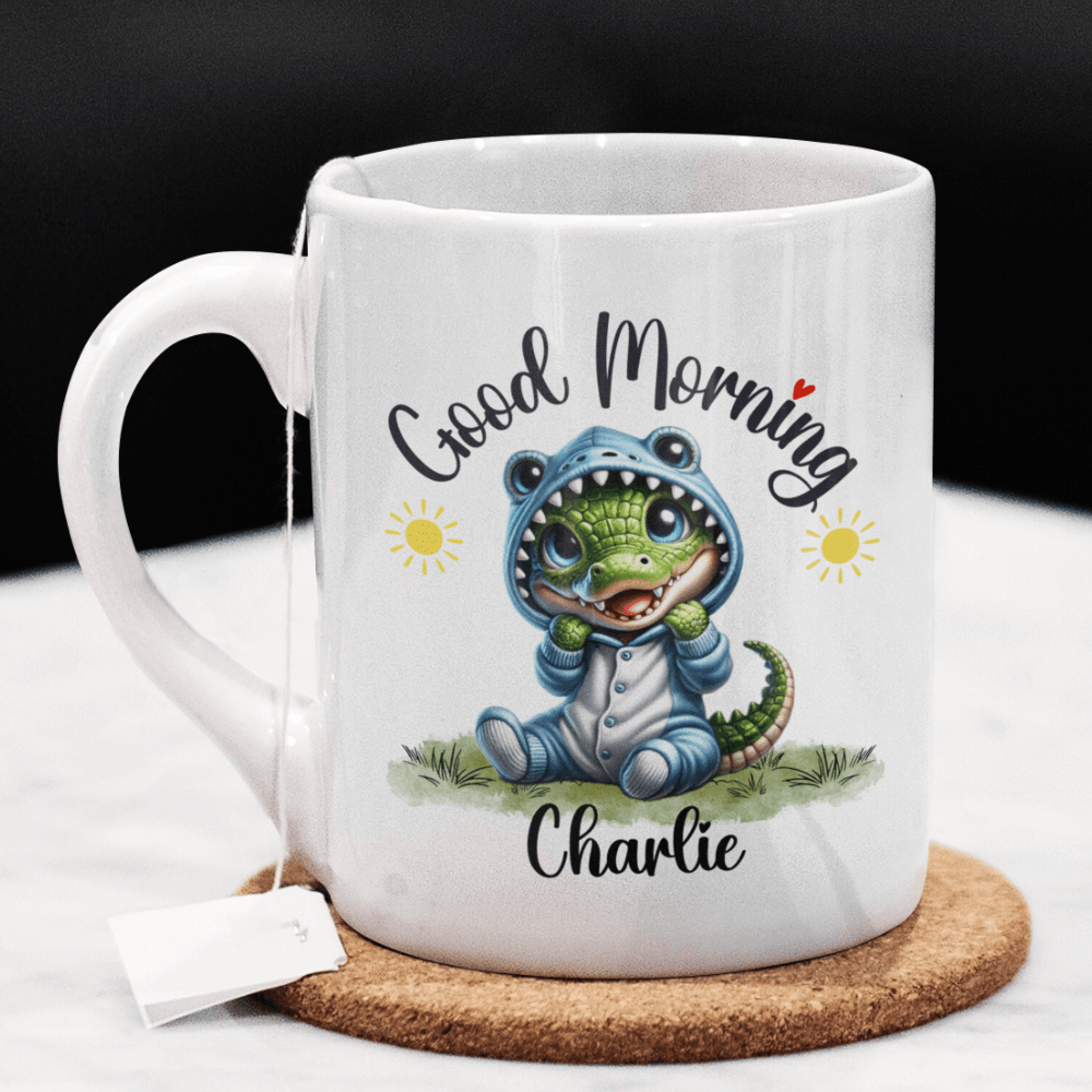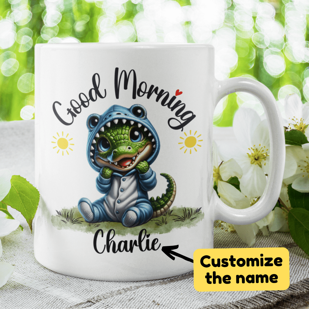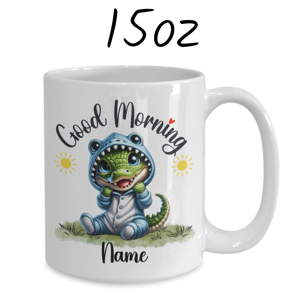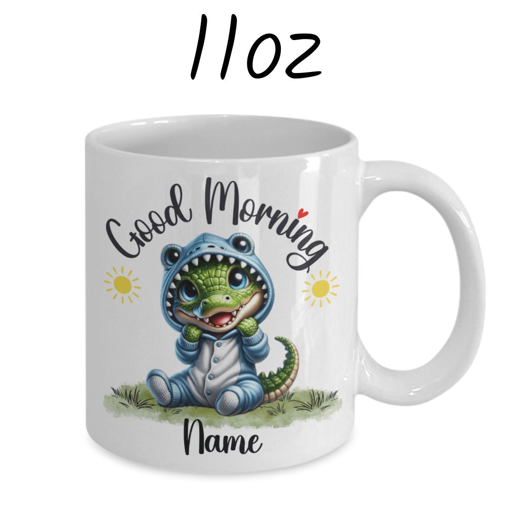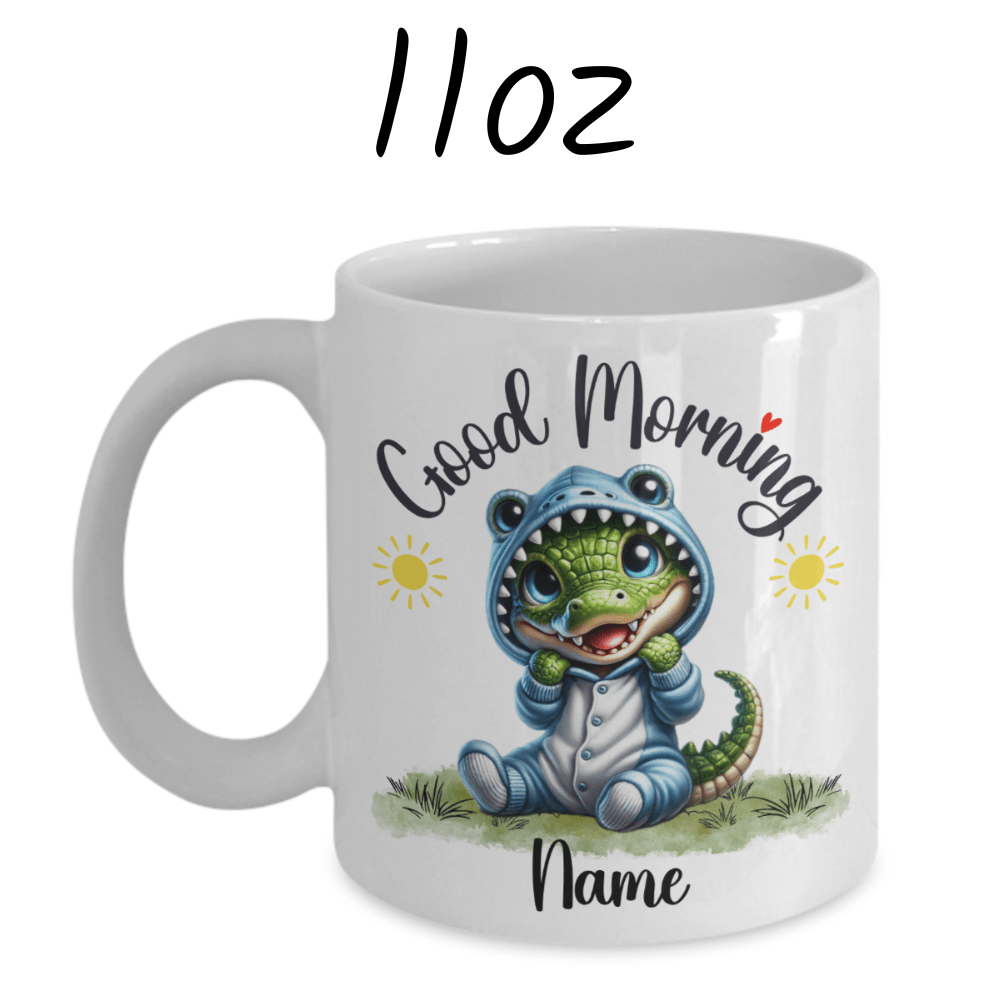 Start your day with a snap of excitement with our "Good Morning" alligator coffee mug, perfect for those who adore these fascinating creatures. Featuring a delightful cartoon drawing of an adorable alligator, this mug can be personalized with your name or the name of a loved one right under the alligator image, making each sip a little more special.