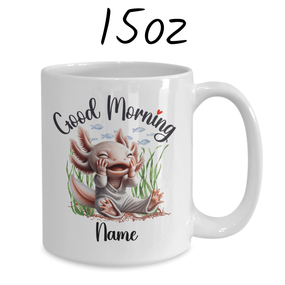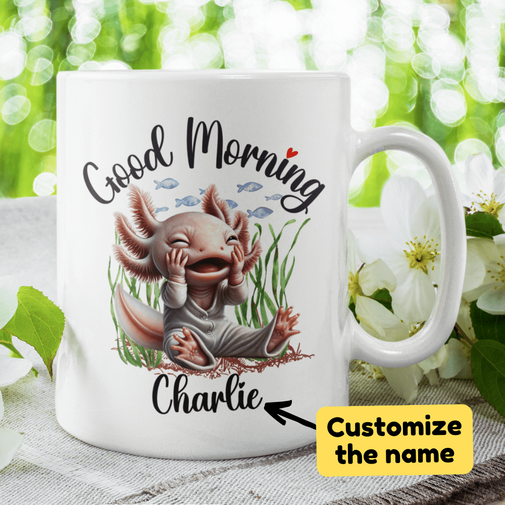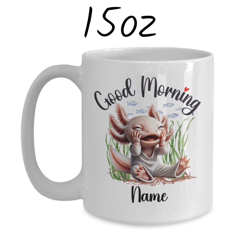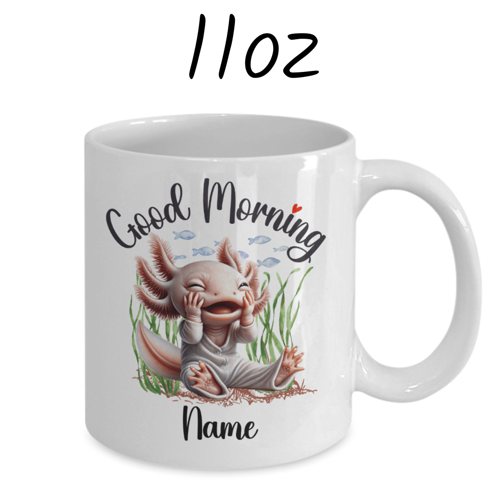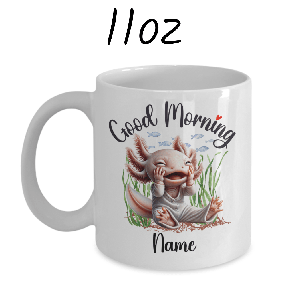 Start your day off right with our charming "Good Morning" axolotl coffee mug, featuring a beautifully cartooned adorable axolotl that's sure to bring a smile to any pet lover's face. Perfect for adding a personalized touch, this mug allows you to customize it with a name right under the cheerful axolotl image.