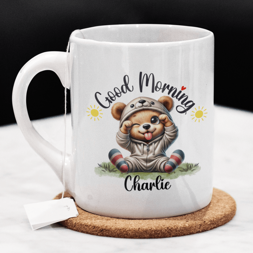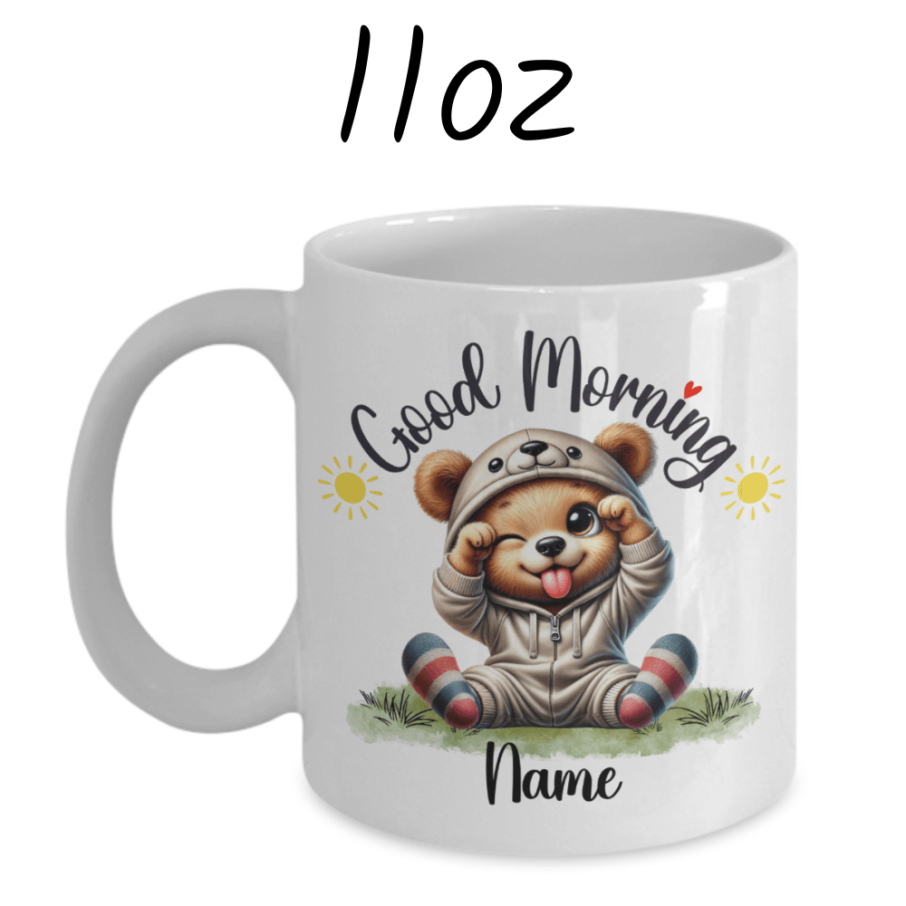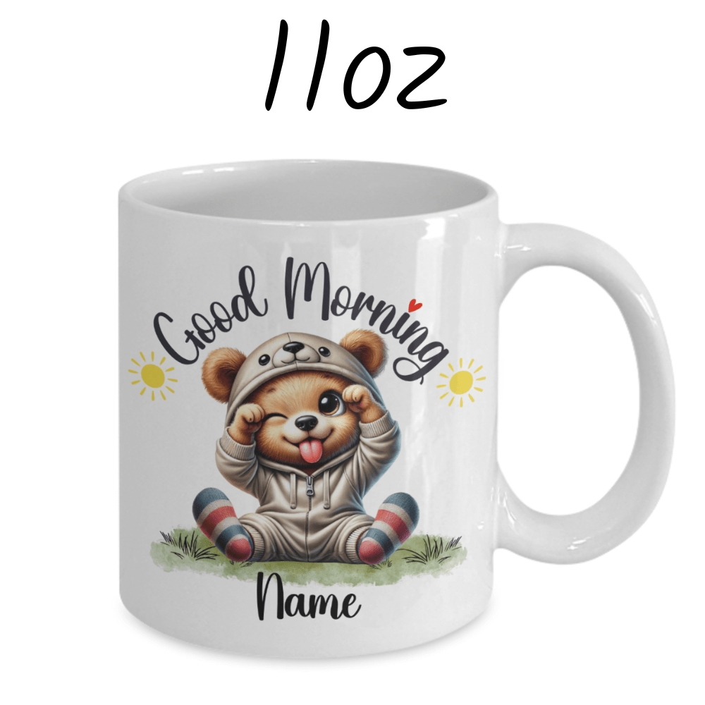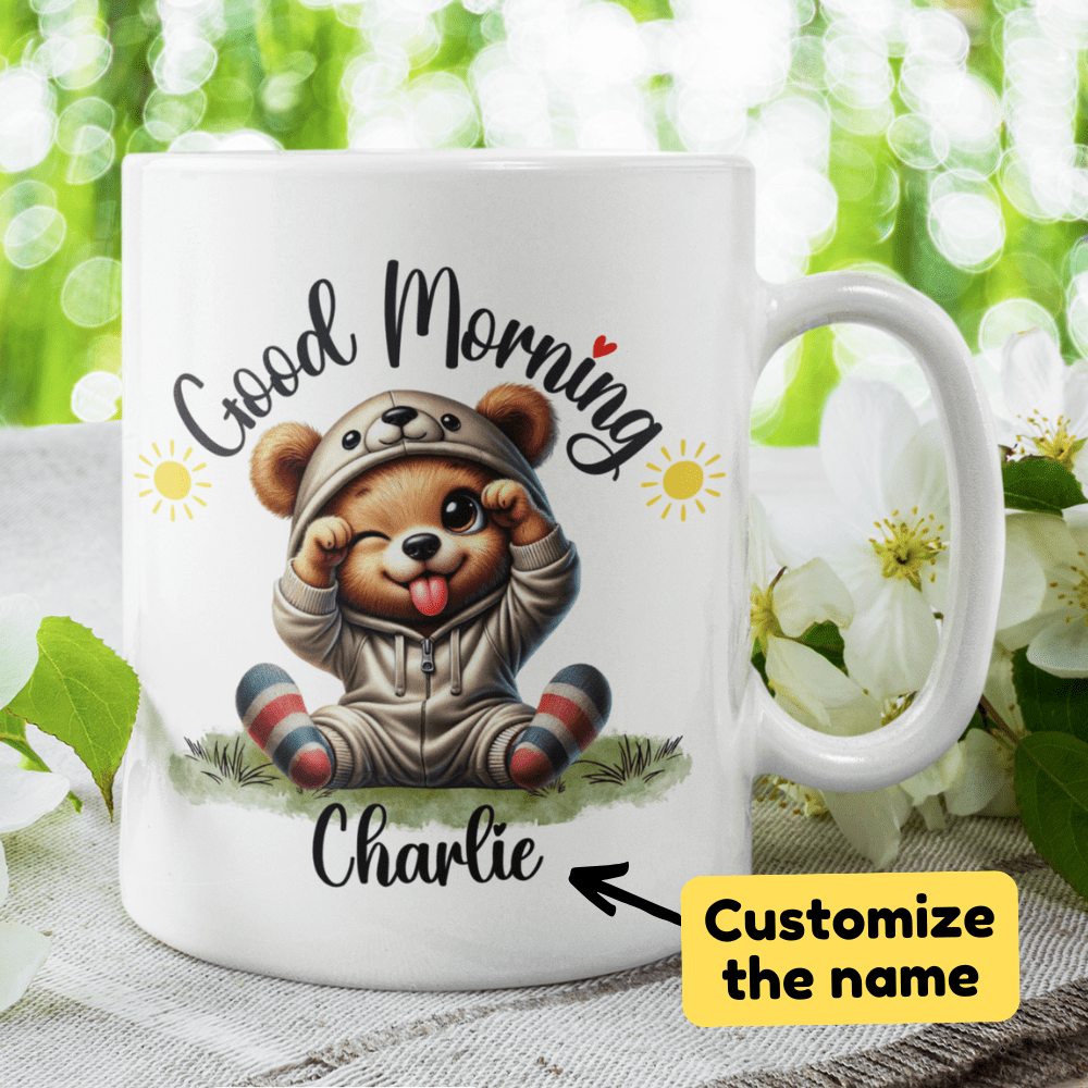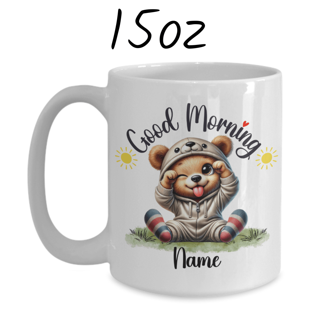 Start each day with a roar of delight with our "Good Morning" bear coffee mug, featuring a beautifully illustrated cartoon bear that's irresistibly adorable. This mug allows for customization with a name under the charming bear image, making it a perfect, personalized way to enjoy your morning brew.
