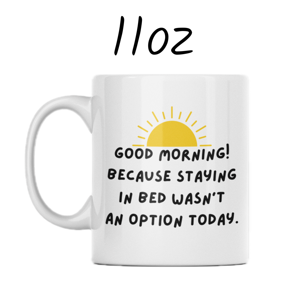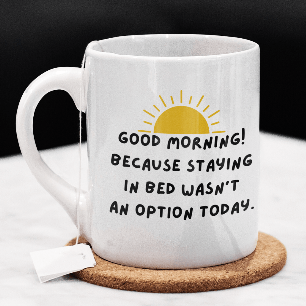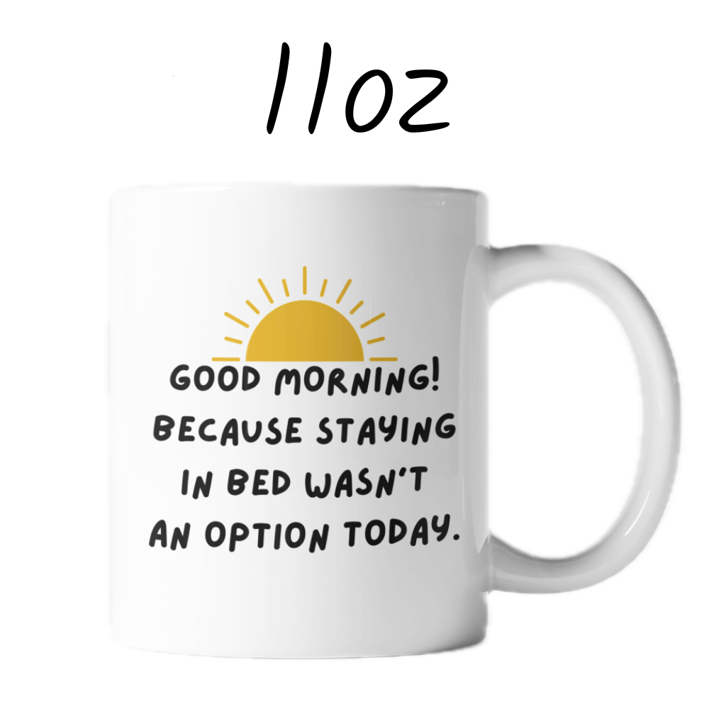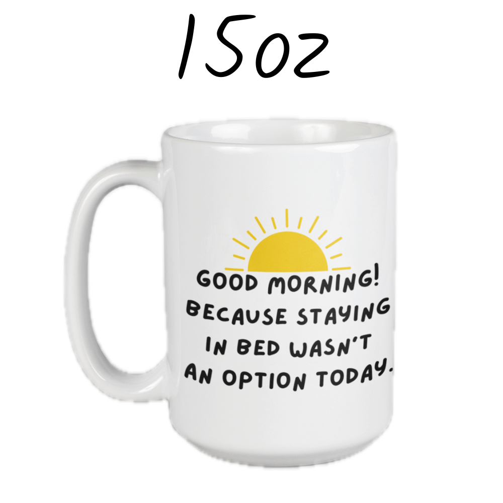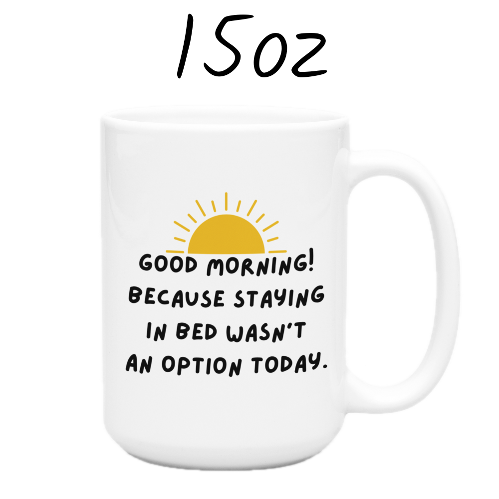Rise and shine (because you have to) with our "Good morning! Because staying in bed wasn't an option today." coffee mug! This mug features a playful quote topped with a cartoon drawing of a half sun, perfectly capturing the sentiment of reluctant early risers everywhere. Ideal for anyone who greets the morning with a touch of humor and a lot of coffee.