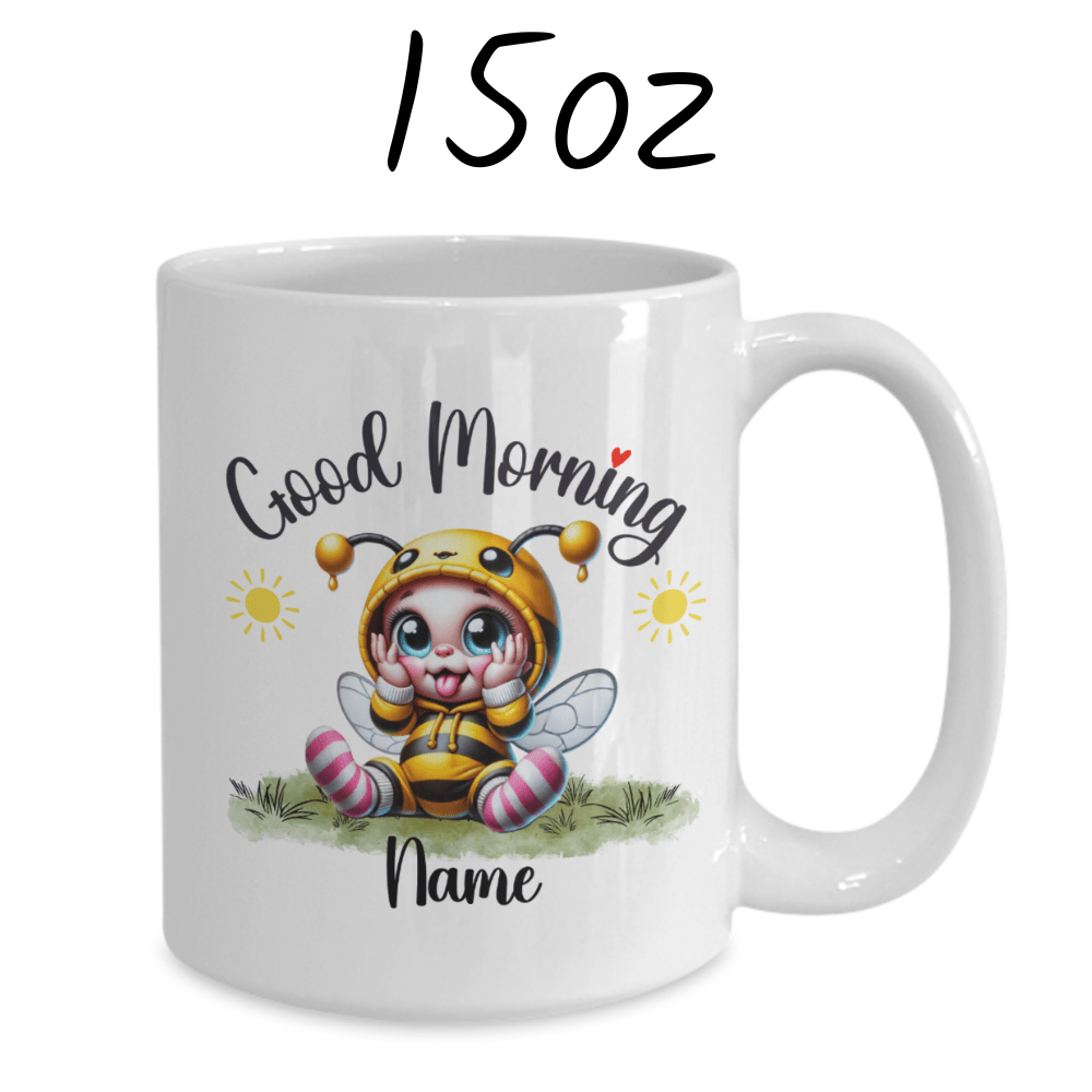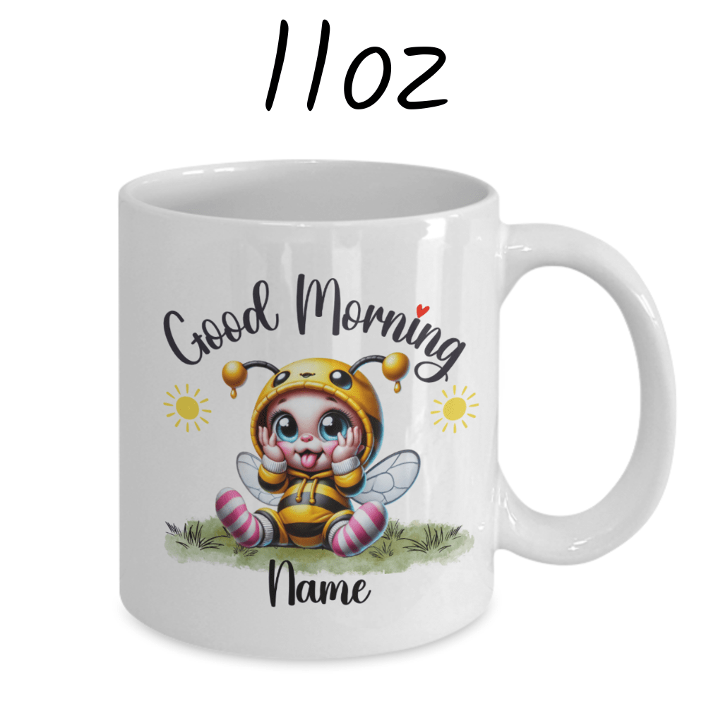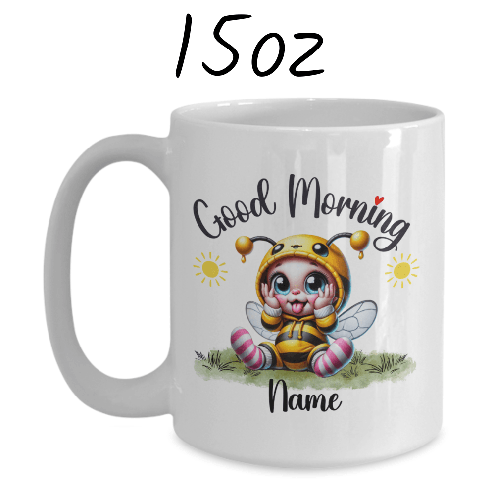 Buzz into your mornings with our "Good Morning" bee coffee mug, adorned with a cheerful cartoon drawing of an adorable bee. This delightful mug offers the option to customize it with a name right under the bee image, making your morning coffee or tea feel even more special.