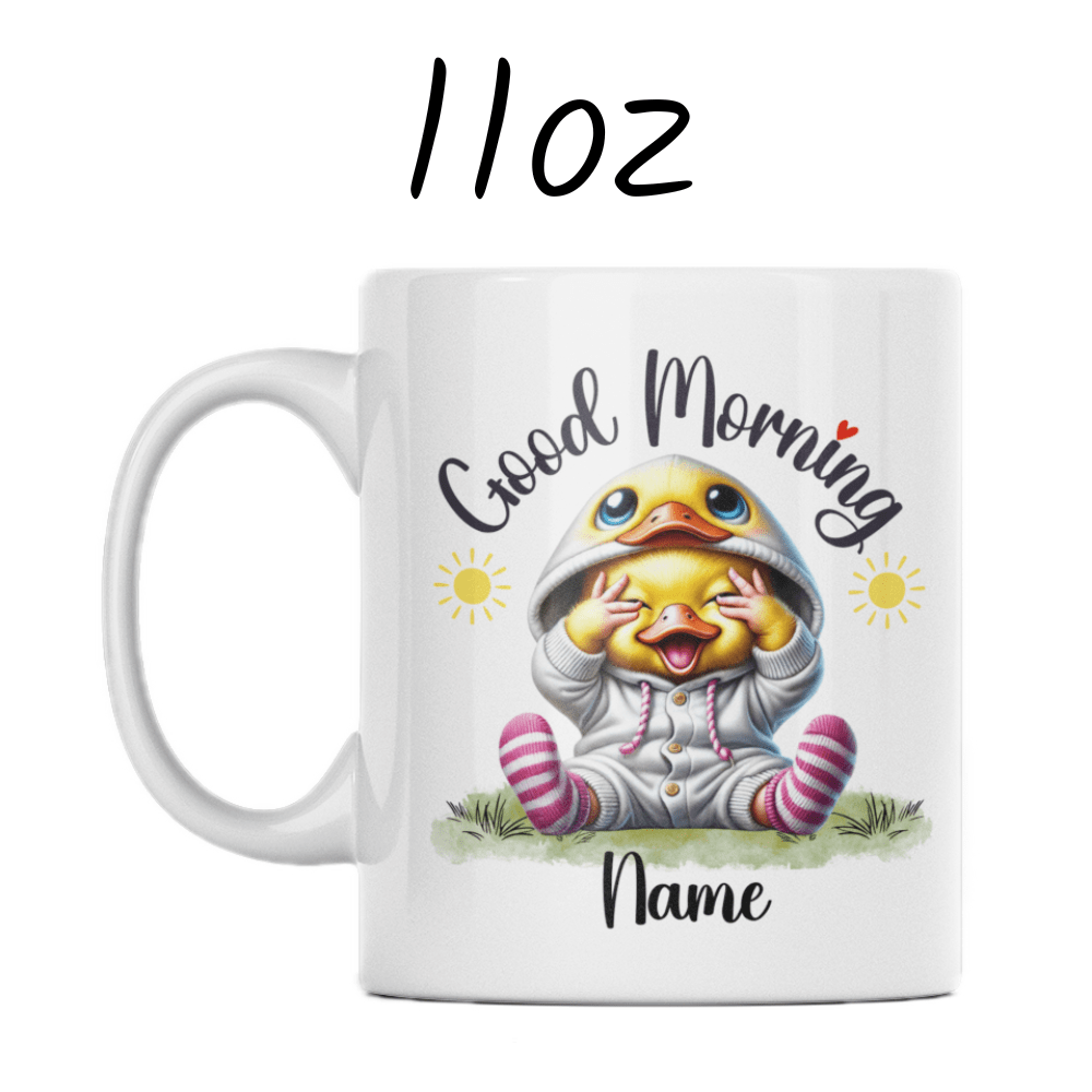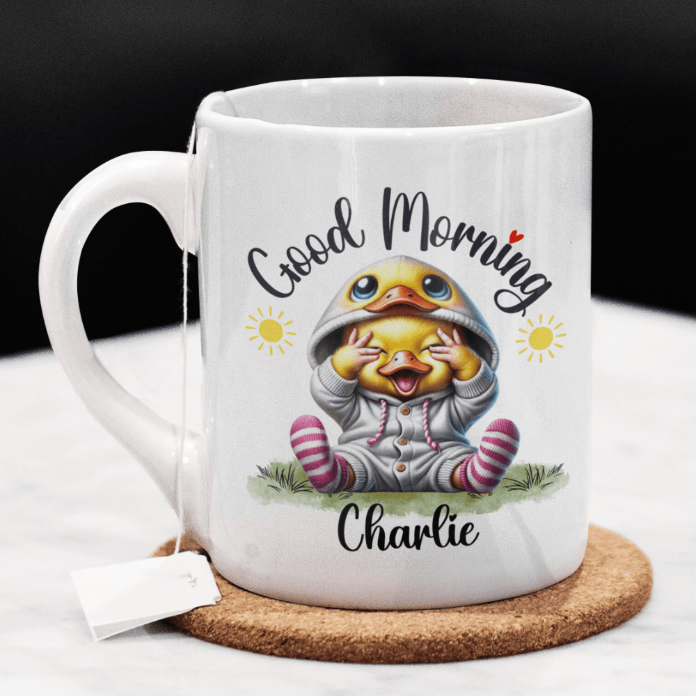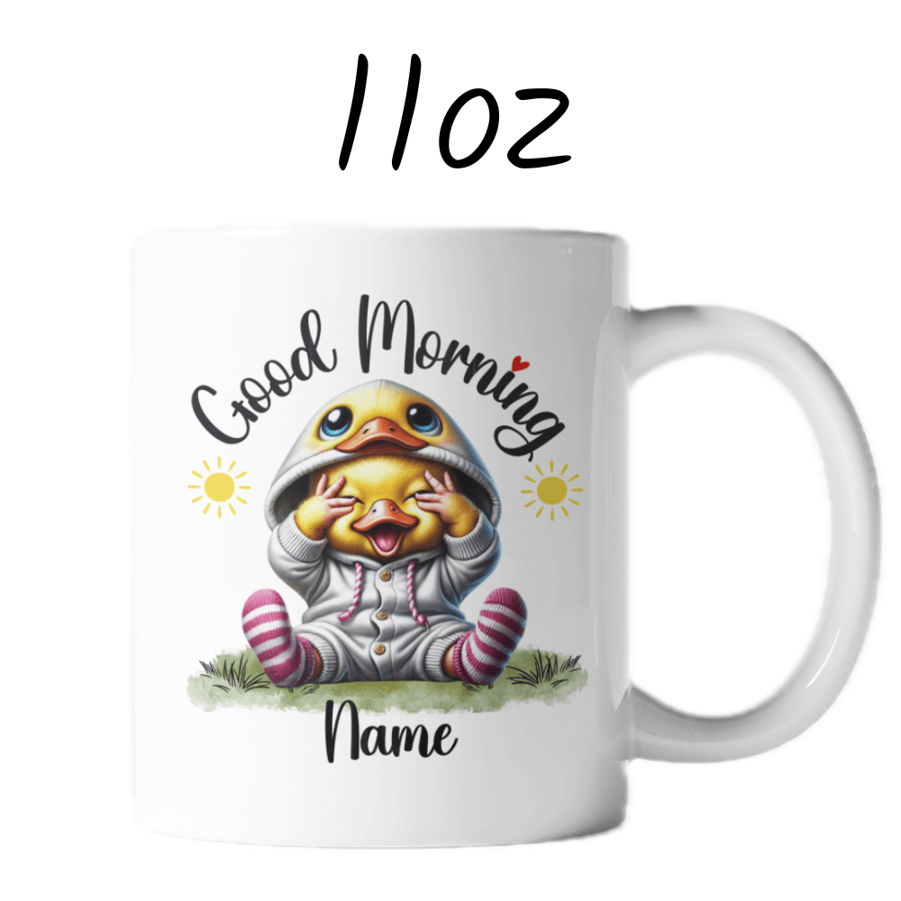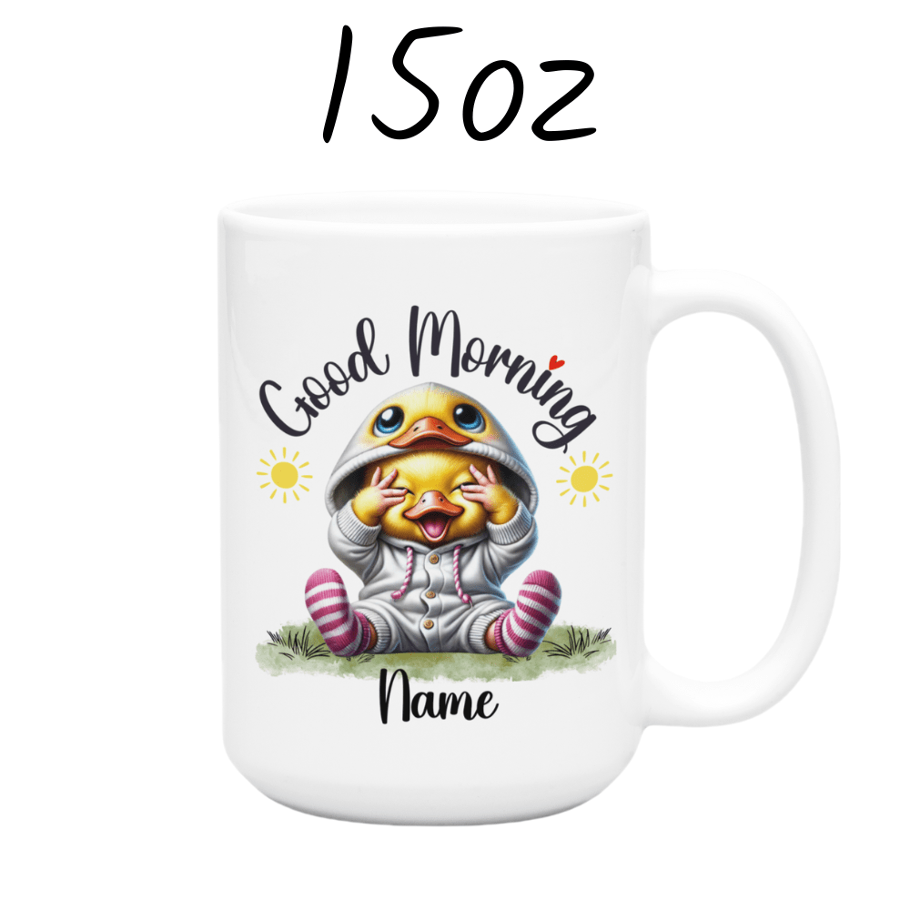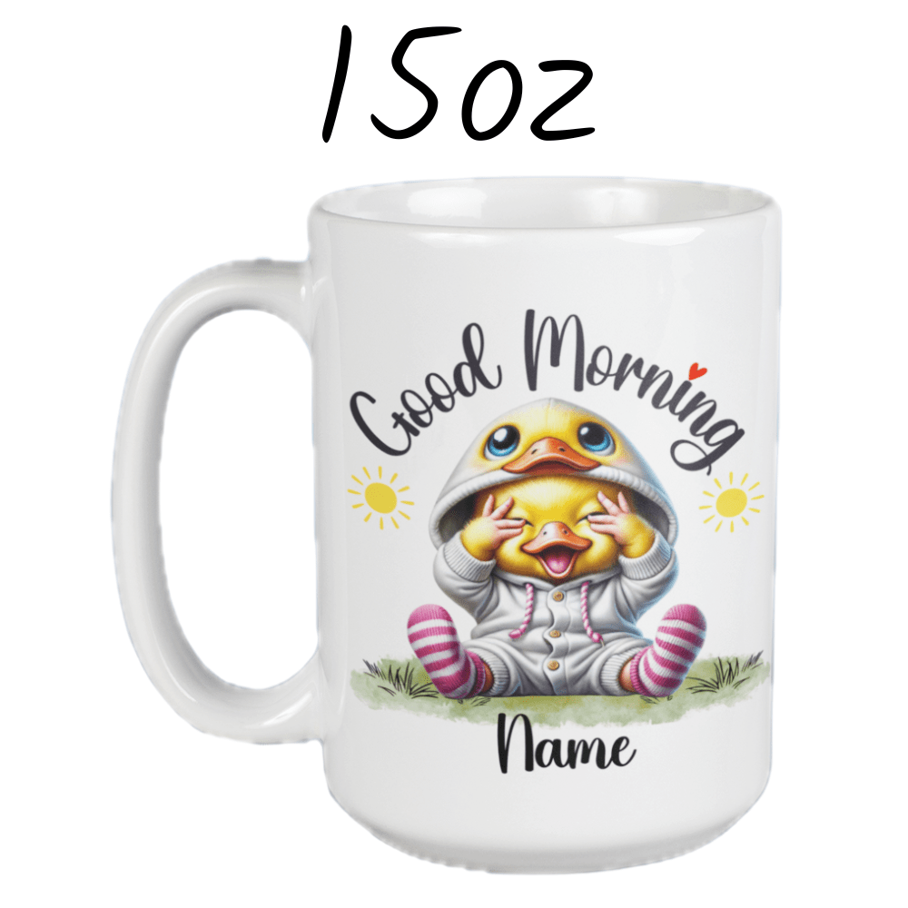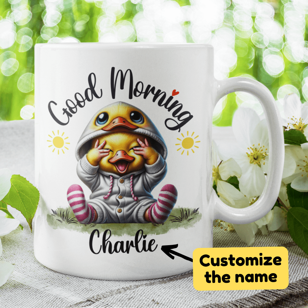 Start your day with a quack and a smile with our "Good Morning" duck coffee mug, perfect for any duck enthusiast! This charming mug features a beautifully cartooned duck, offering a dose of cuteness with every sip. Plus, you can personalize it with your name or a loved one's name right under the adorable duck illustration.