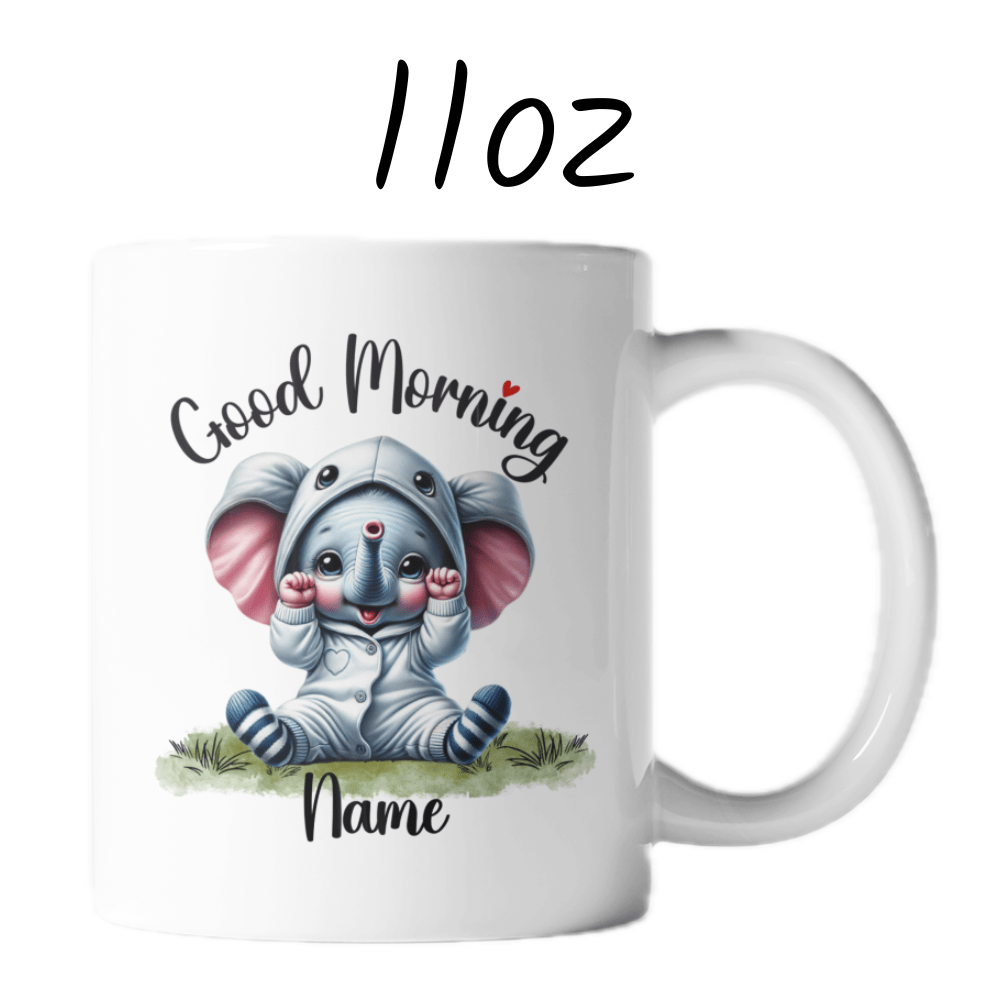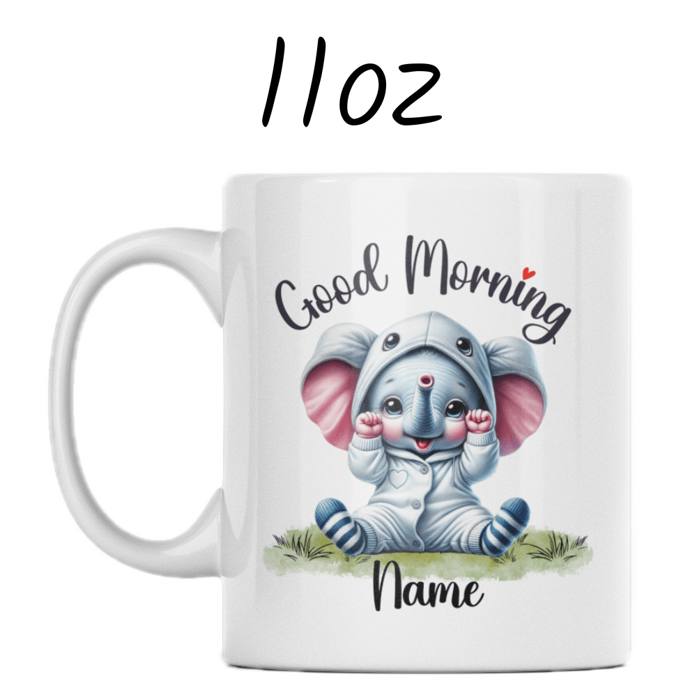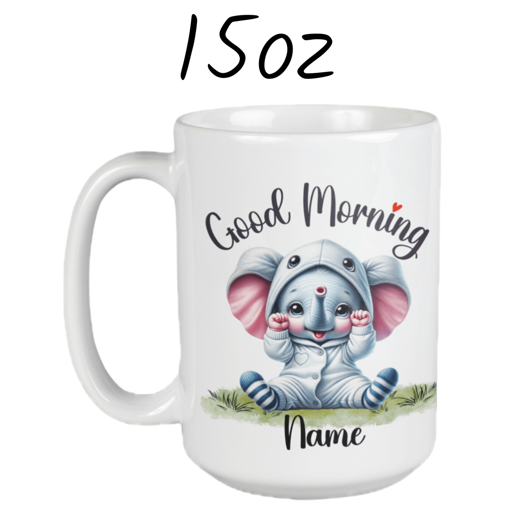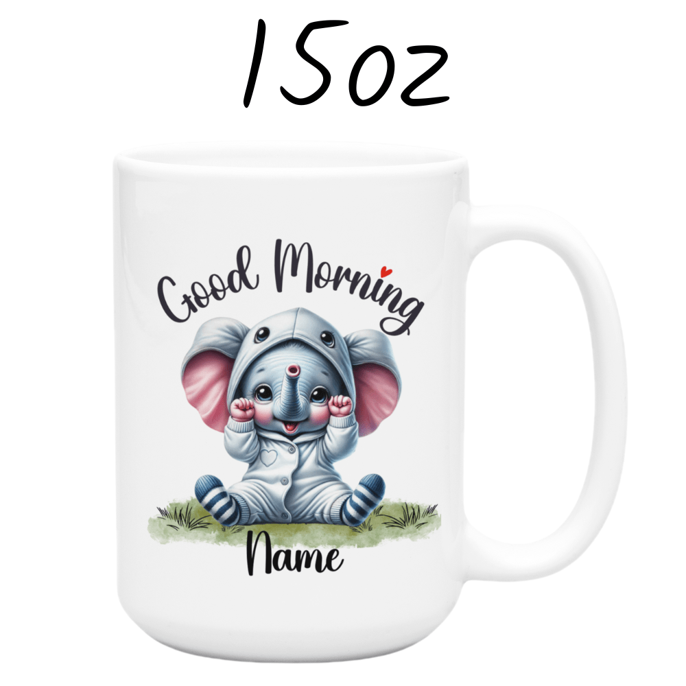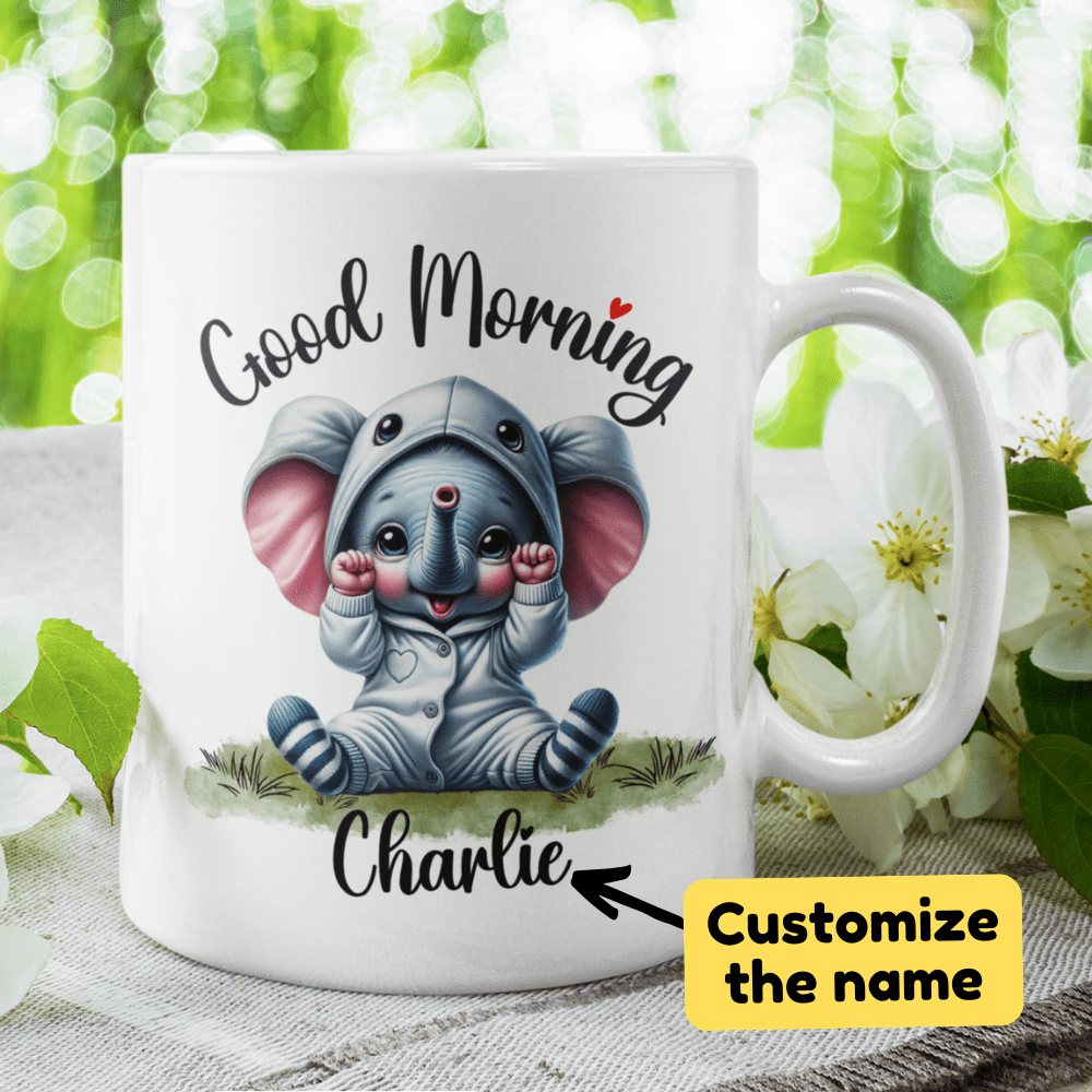 Start your day with a giant dose of cuteness with our "Good Morning" elephant coffee mug! This delightful mug features a beautifully illustrated cartoon elephant that's sure to bring a smile to any elephant lover's face. Customize it with your name or a special someone's name right under the adorable elephant to make every morning brew feel personal and joyful.