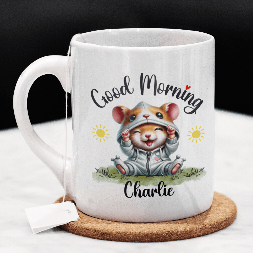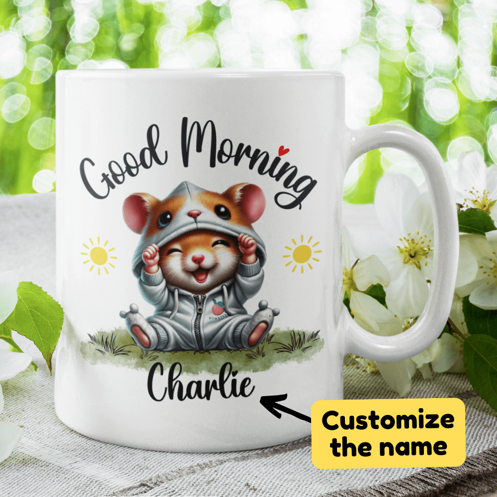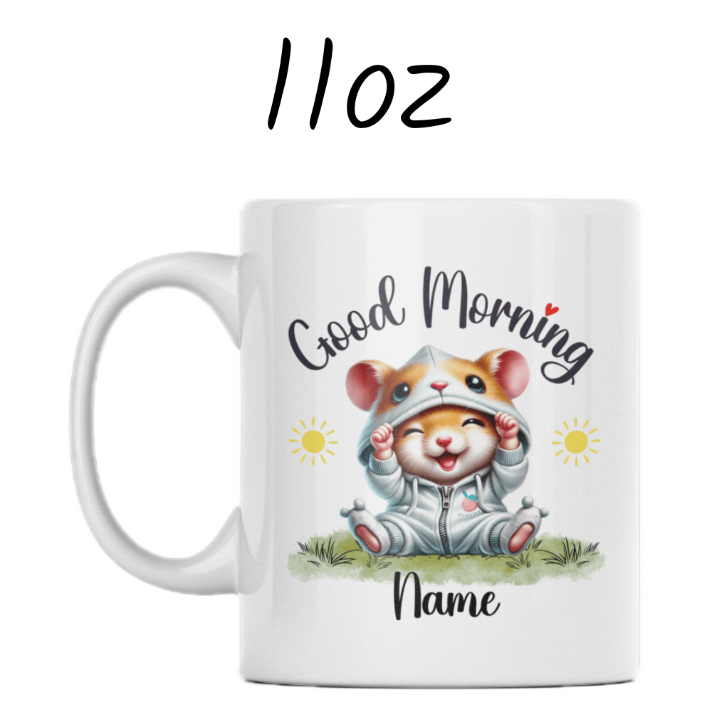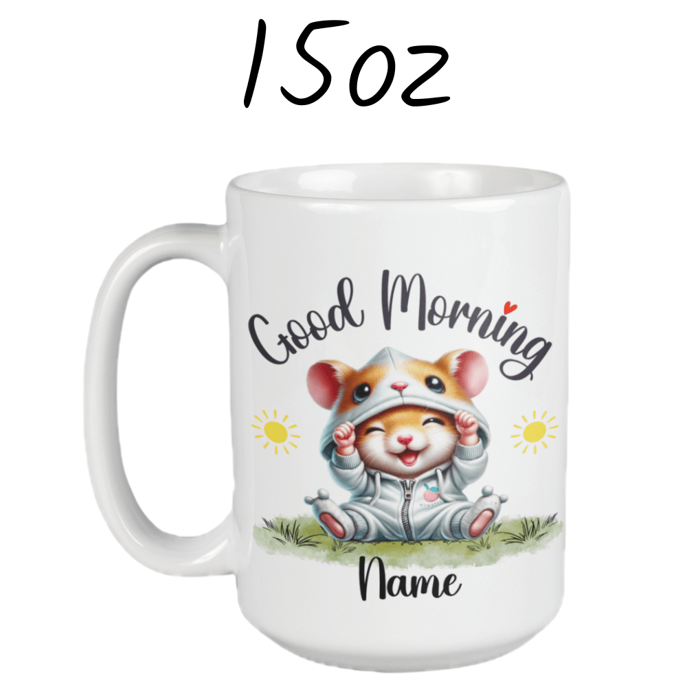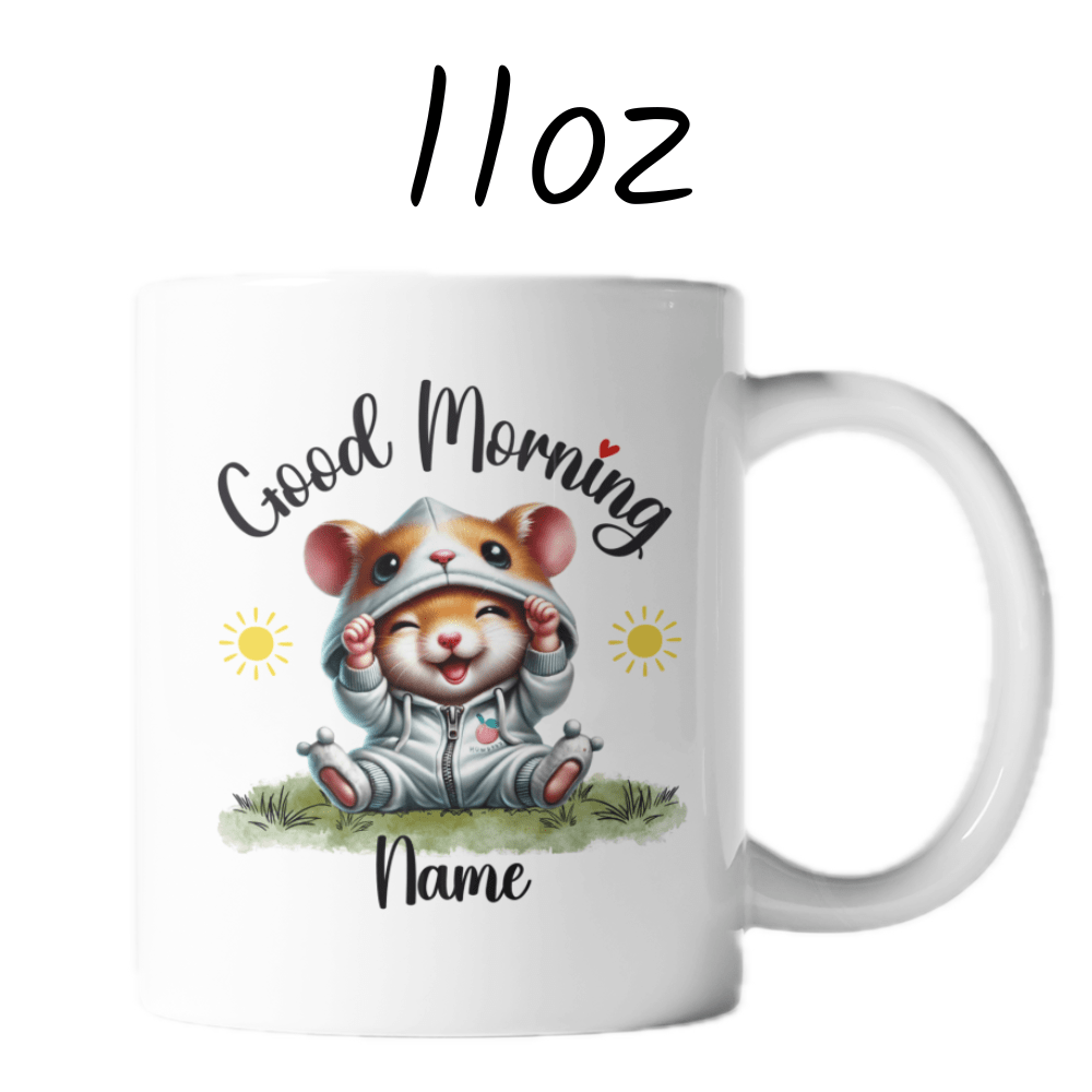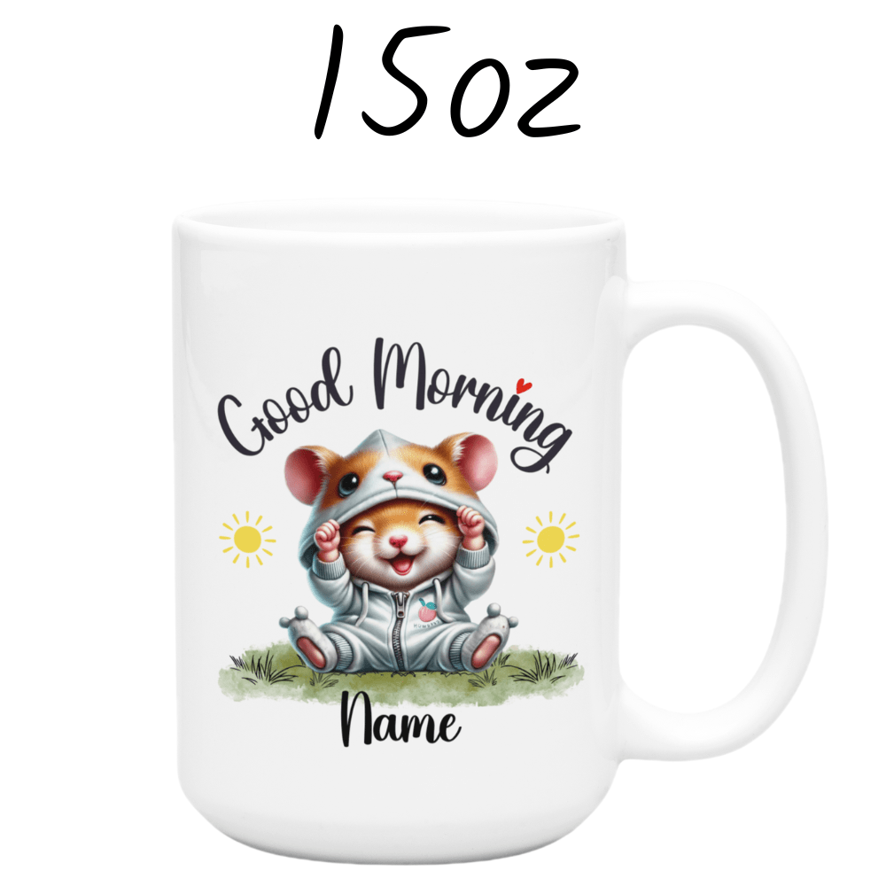 Brighten up your morning with our "Good Morning" hamster coffee mug! This delightful mug features a charming cartoon drawing of an adorable hamster, perfect for any hamster enthusiast. Personalize it with your name or a loved one's name under the hamster image to make every coffee break special.