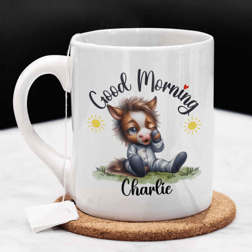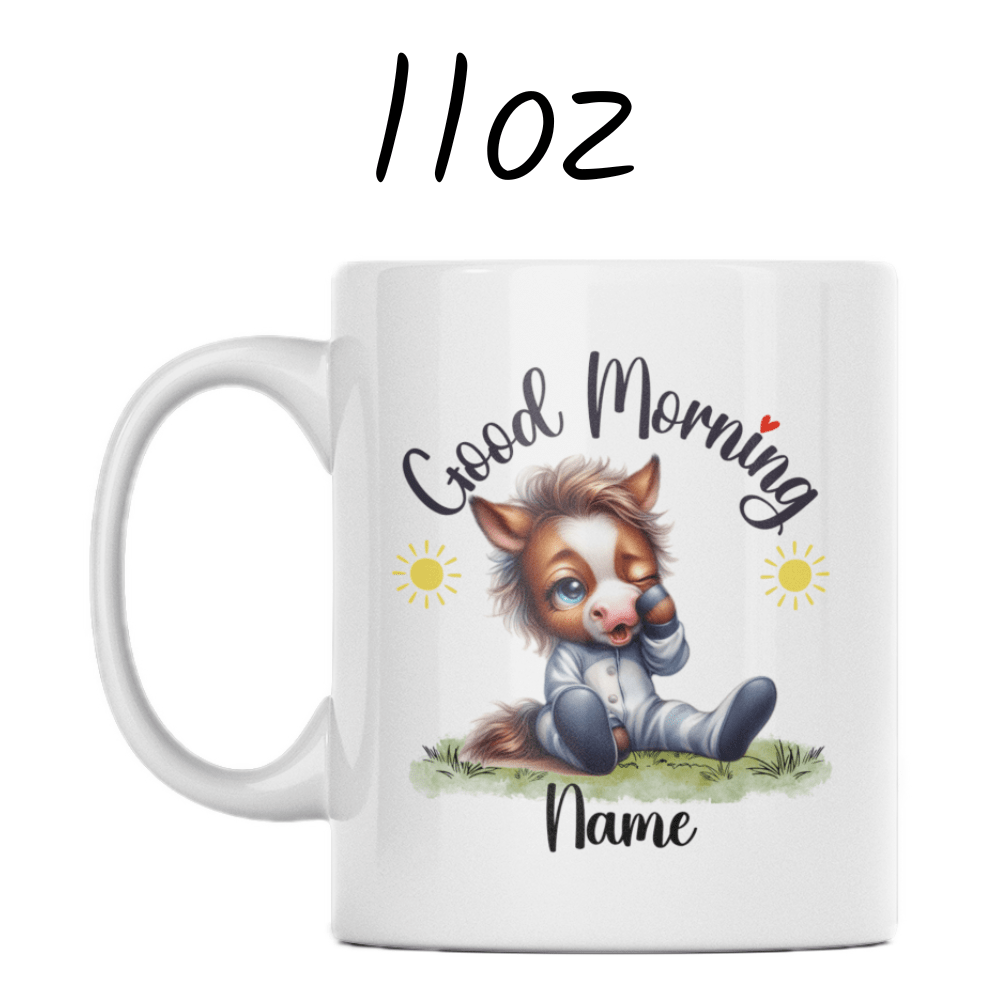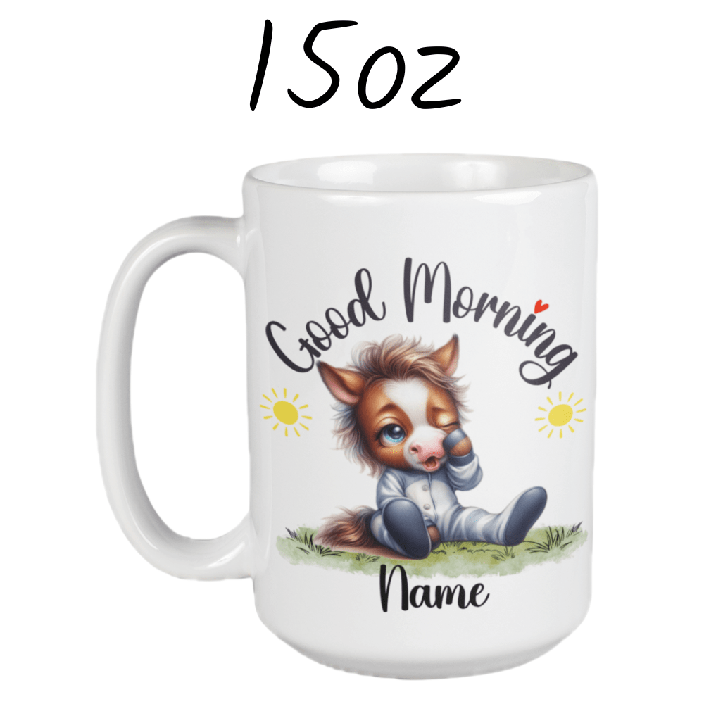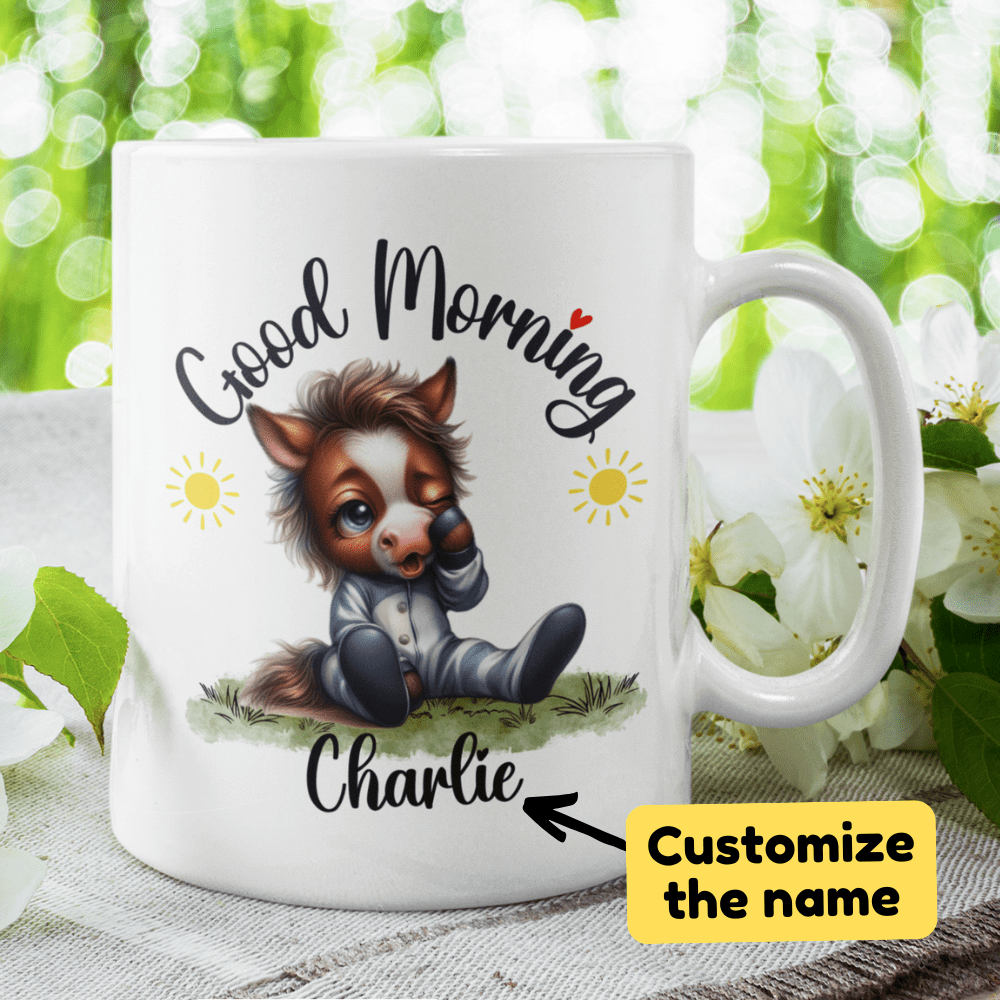 Gallop into your morning routine with our "Good Morning" horse coffee mug! Featuring a charming cartoon illustration of an adorable horse, this mug is perfect for anyone who loves these majestic creatures. Plus, you can personalize it with your name or a loved one's name right under the horse image, making each sip feel especially tailored to you or as a thoughtful gift.