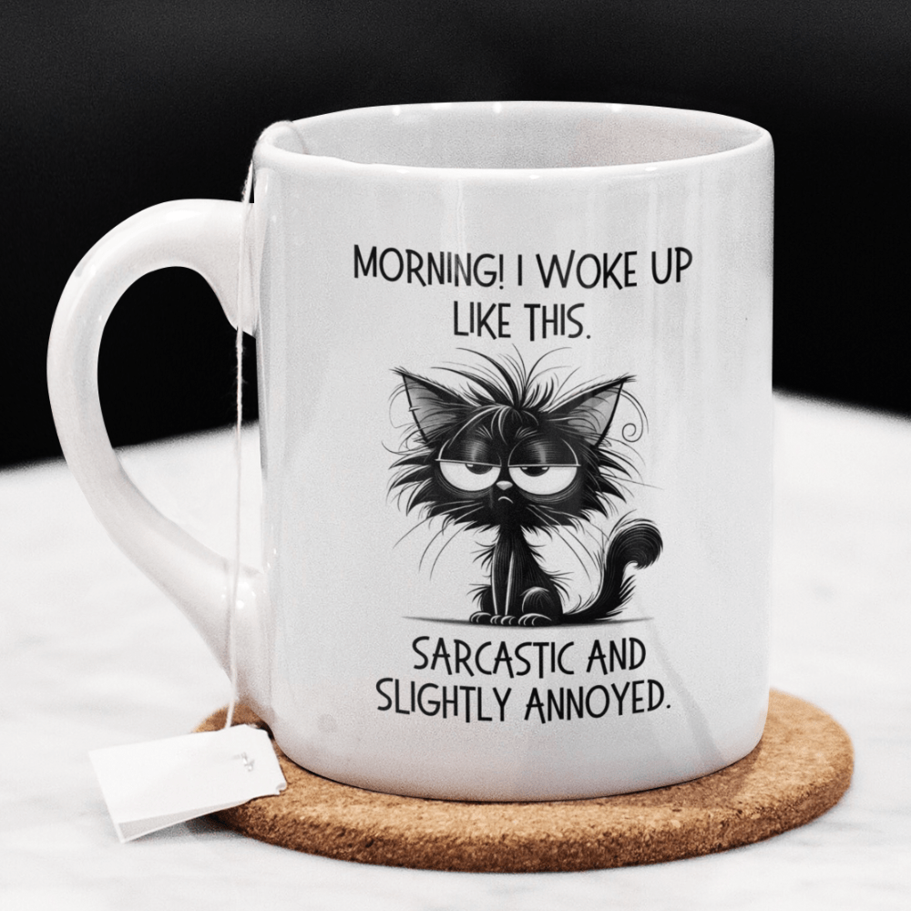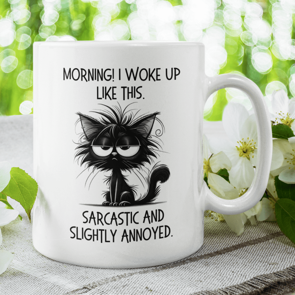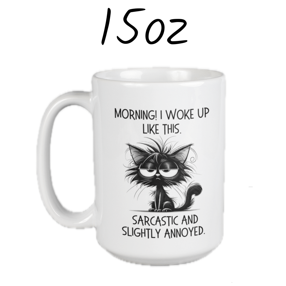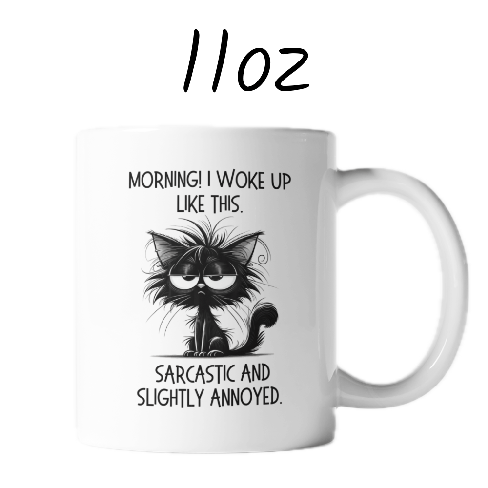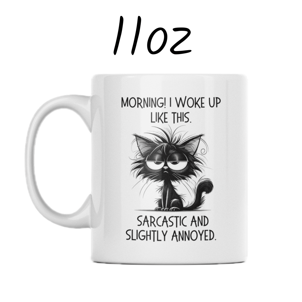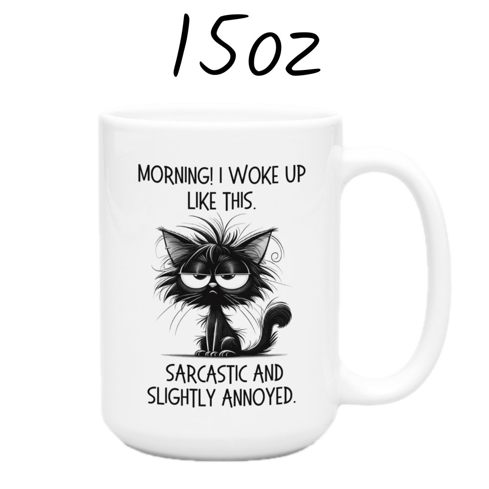 Start your day with a smirk using our "Morning! I woke up like this. Sarcastic and slightly annoyed" coffee mug! This mug features a witty quote alongside a cartoon drawing of a sarcastic, slightly annoyed black cat, making it the perfect companion for anyone who isn't a morning person but loves a good laugh.